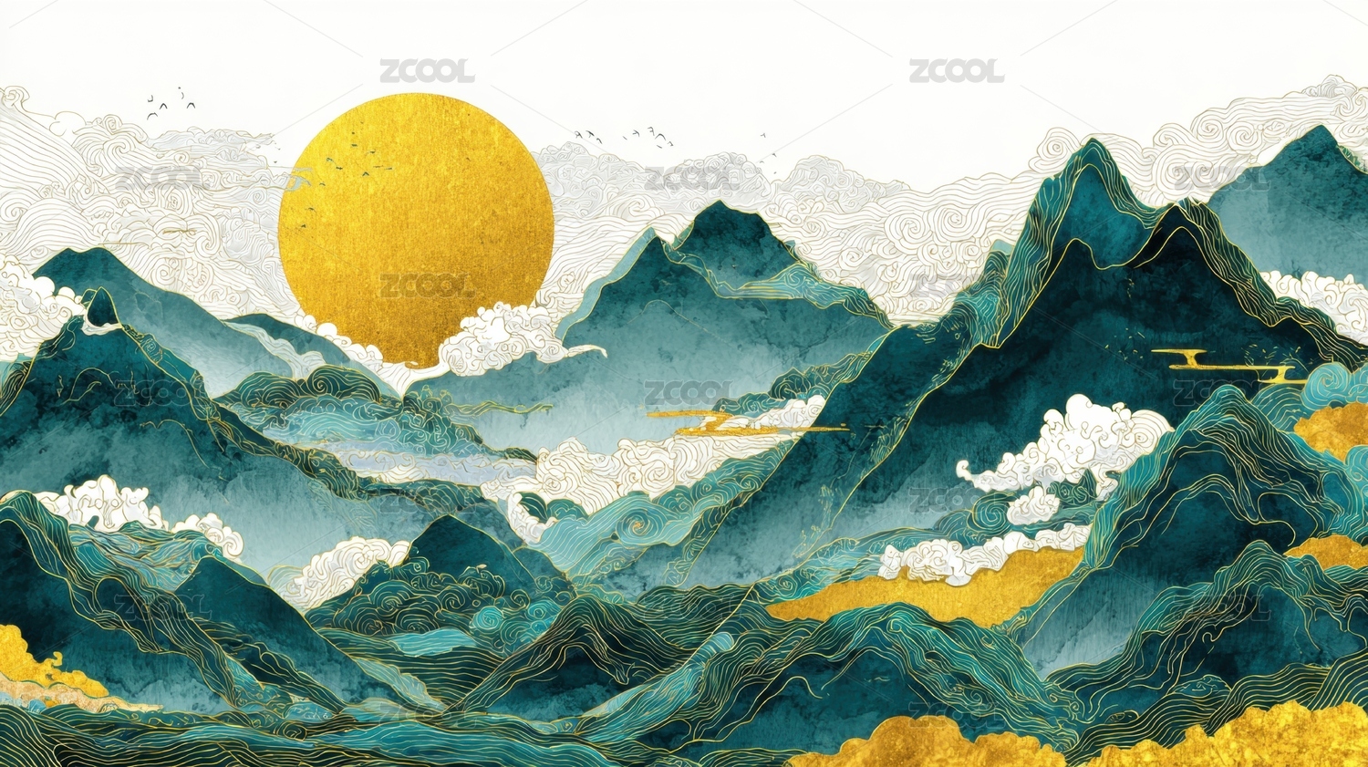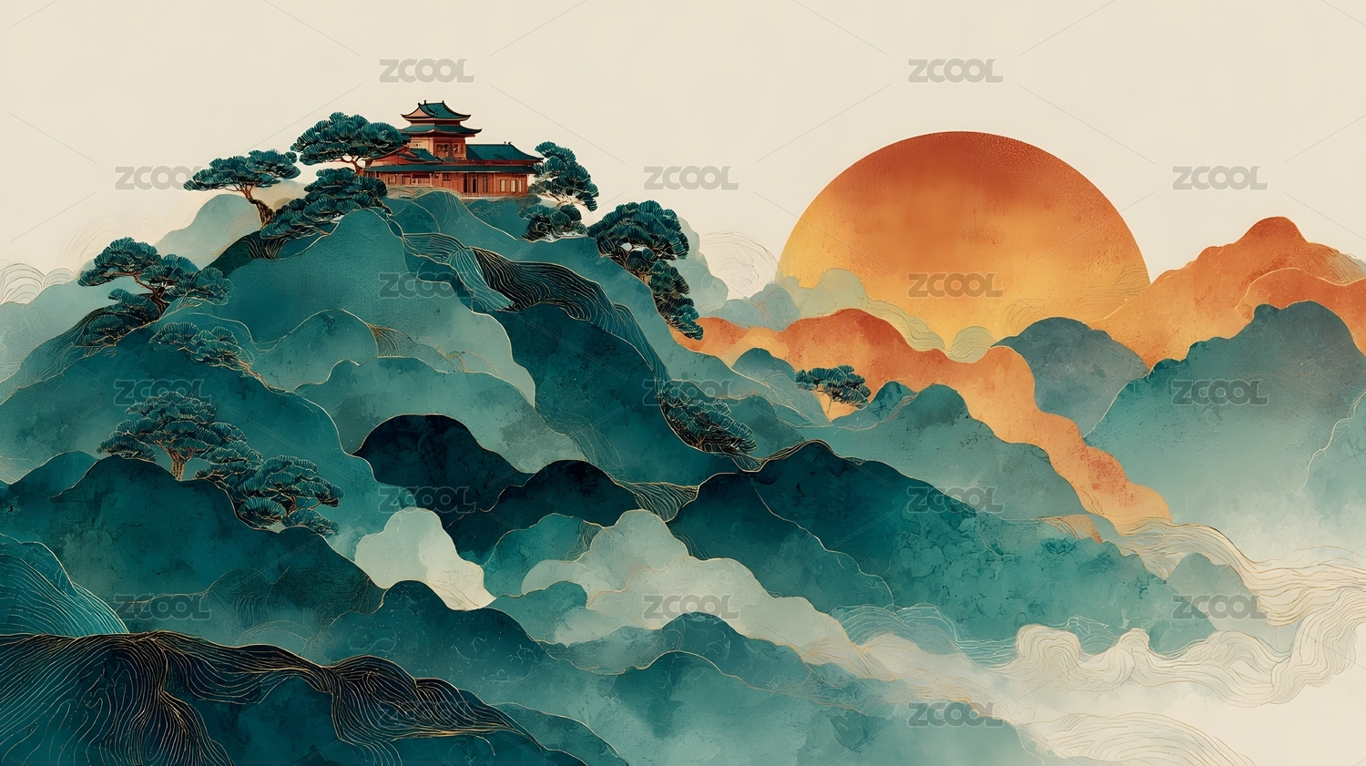 水墨山峦金色亭台