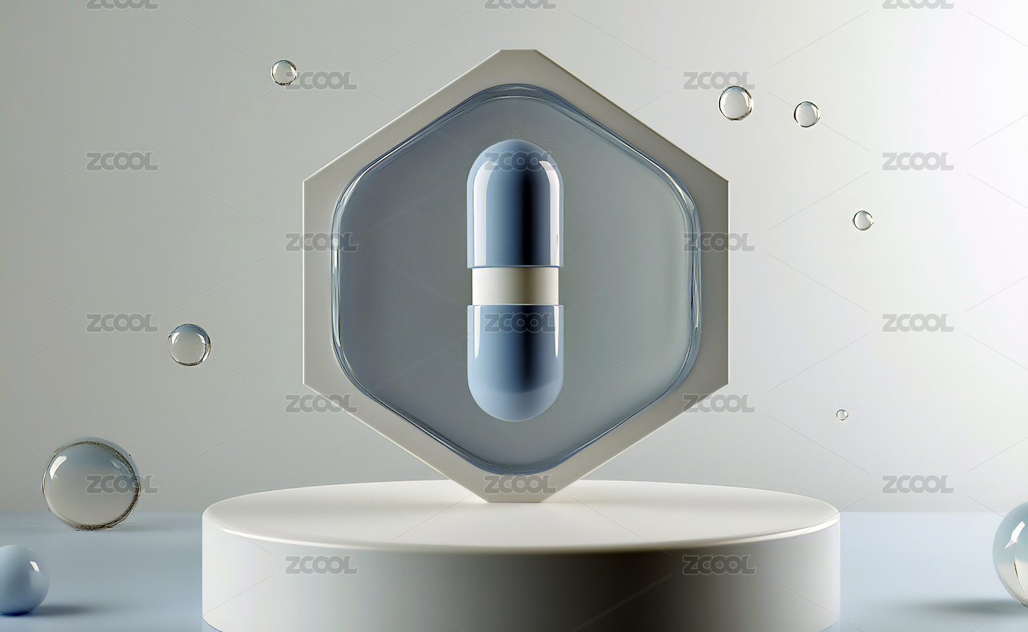 药丸,胶囊,蓝色,白色,玻璃,球体,漂浮,水,3D,渲染