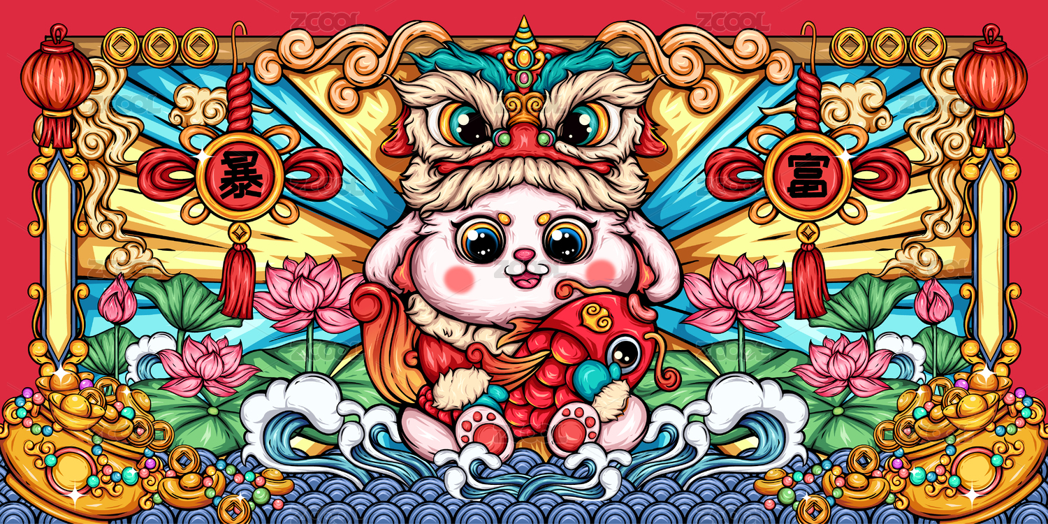 龙年矢量灯笼开门红喷钱枪荷花中国红背景墙