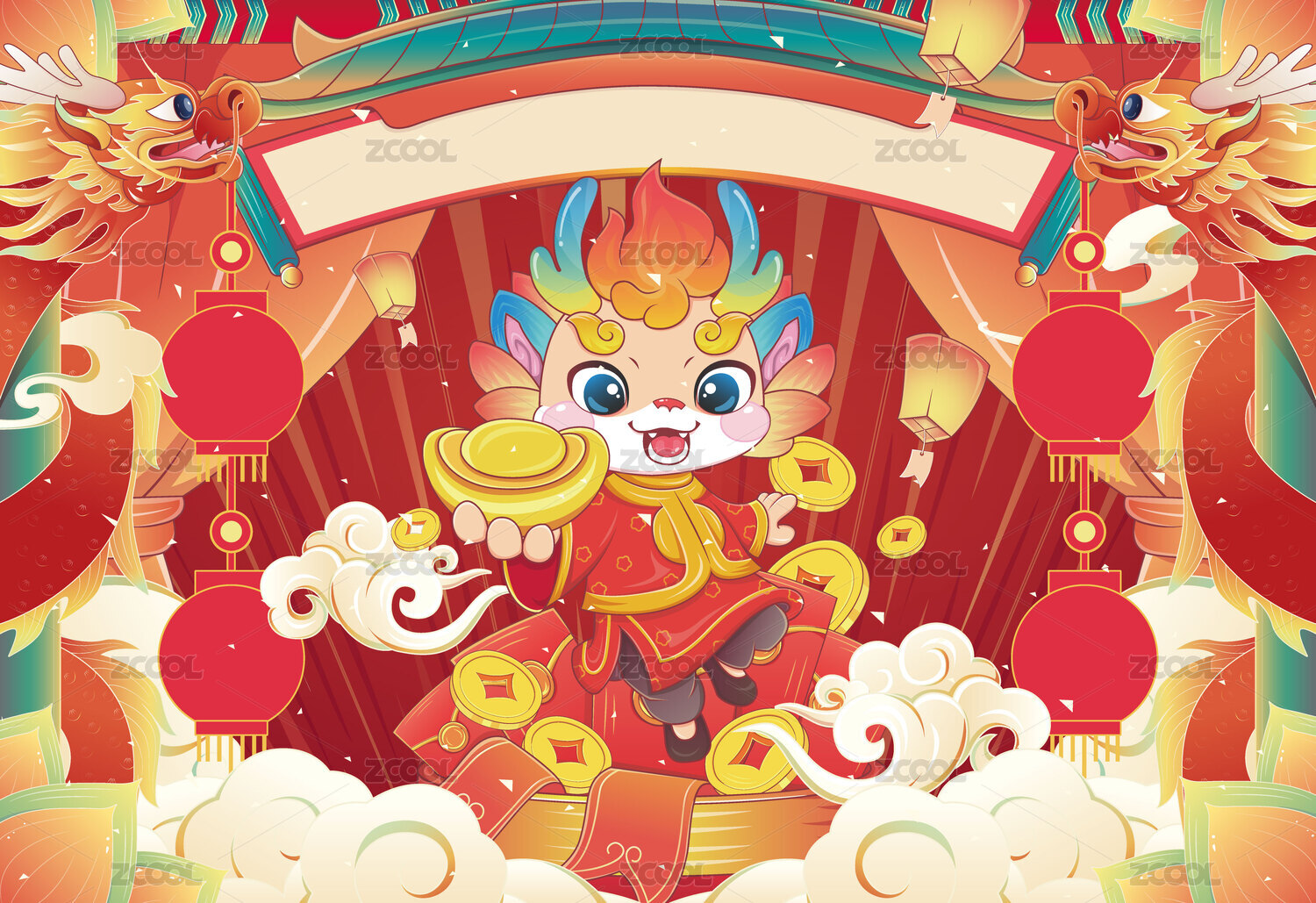 龙年矢量聚宝盆红灯笼吉祥物人偶拜年背景