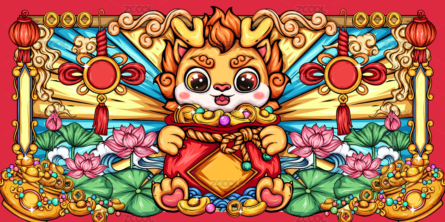 国潮喜庆龙年春节舞龙福龙贺春插画