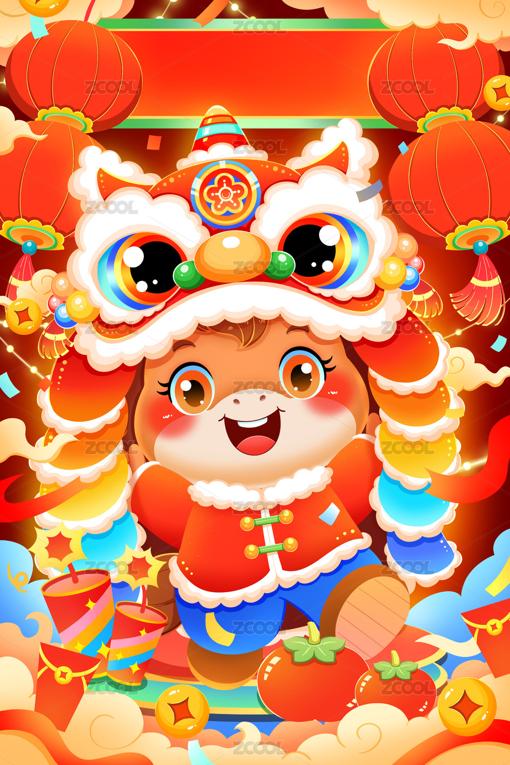 手绘卡通可爱新年龙年舞狮插画