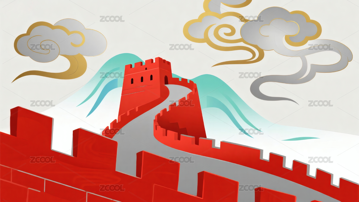 红色长城与祥云图案