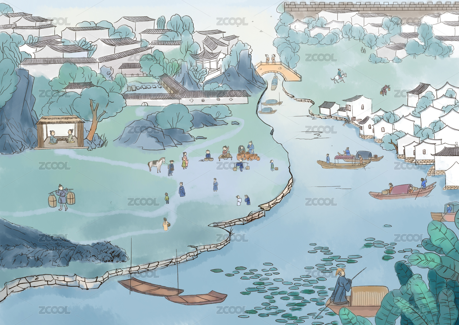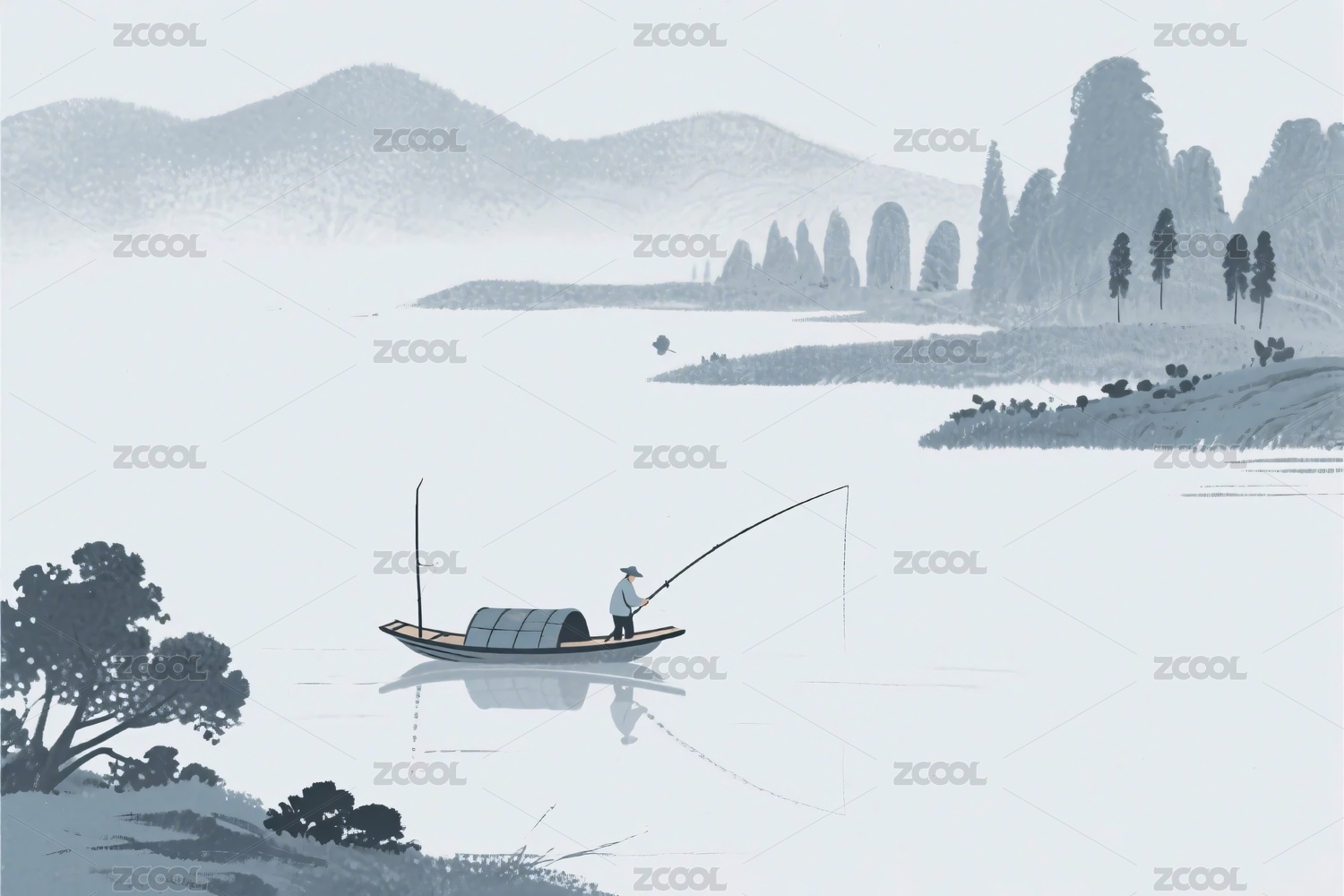 中式山水田园垂钓插画