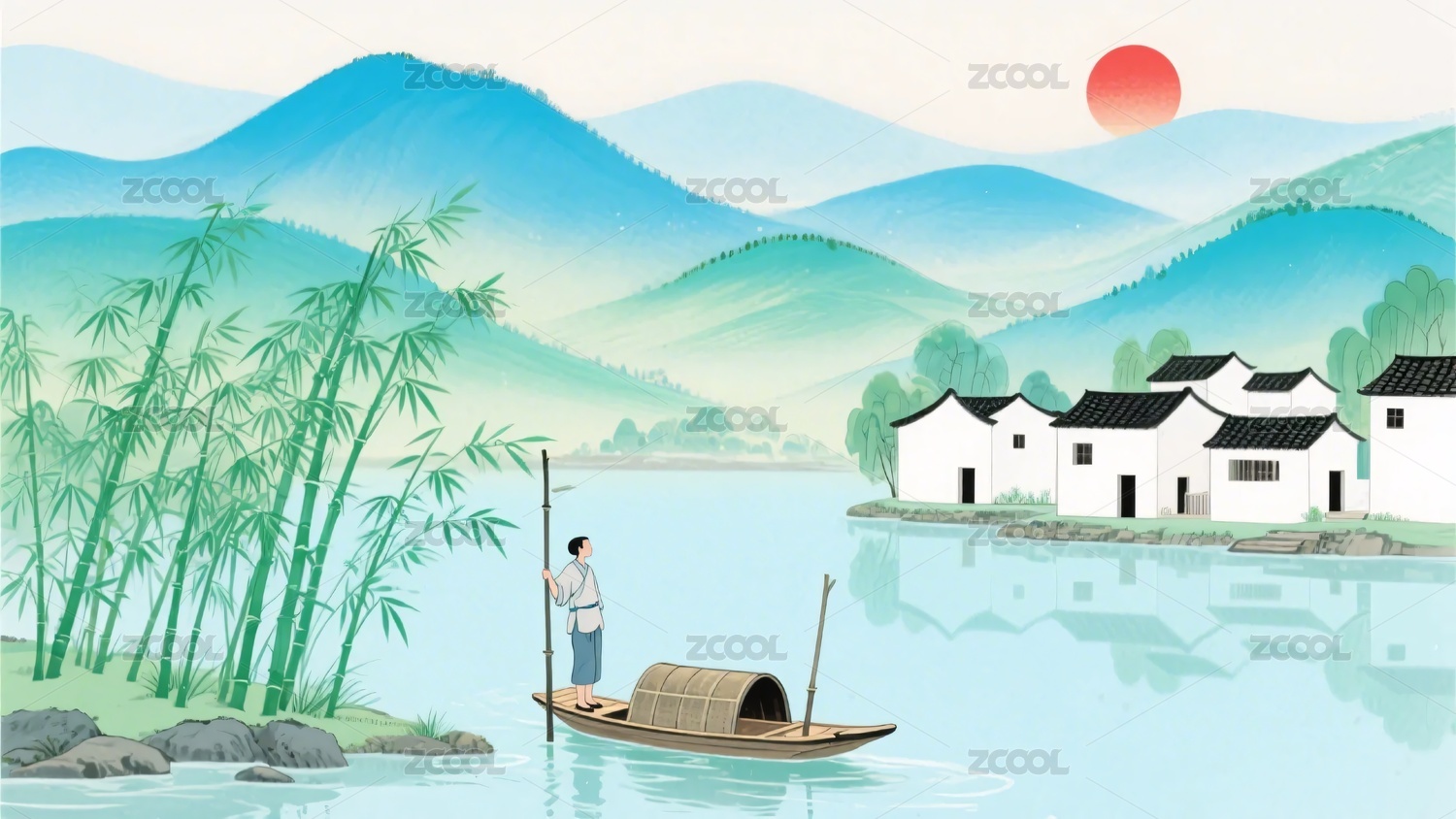 水墨江南渔村景色