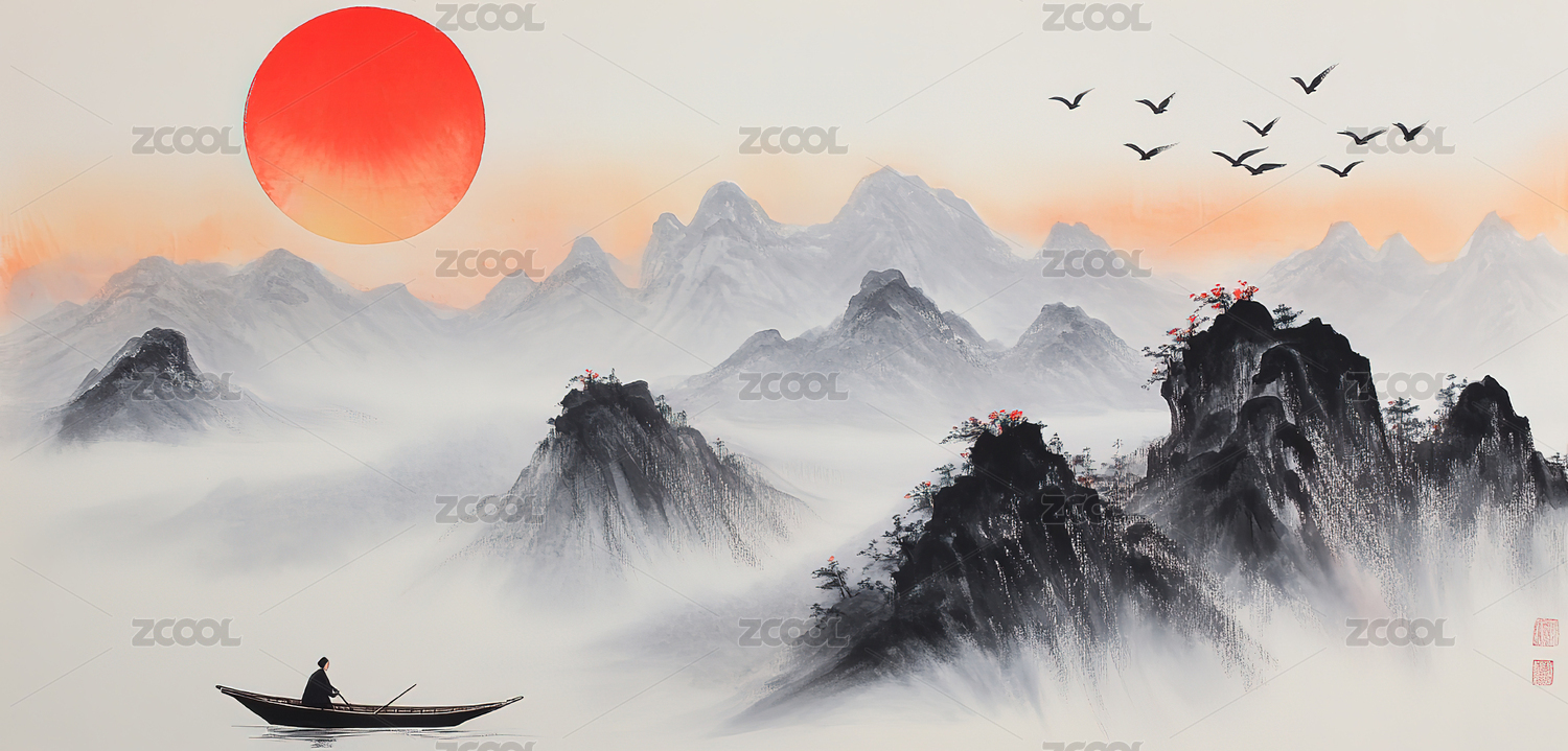 中式山水日出美景图