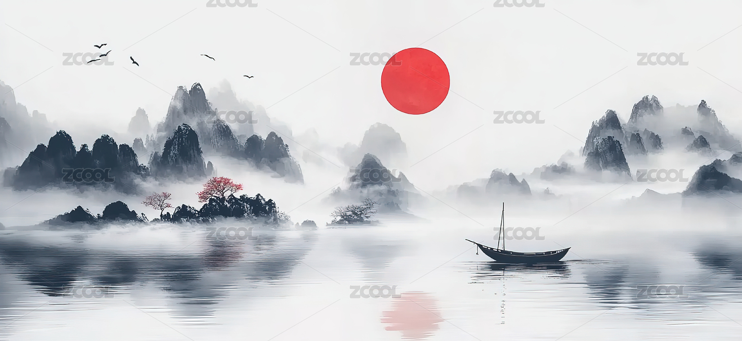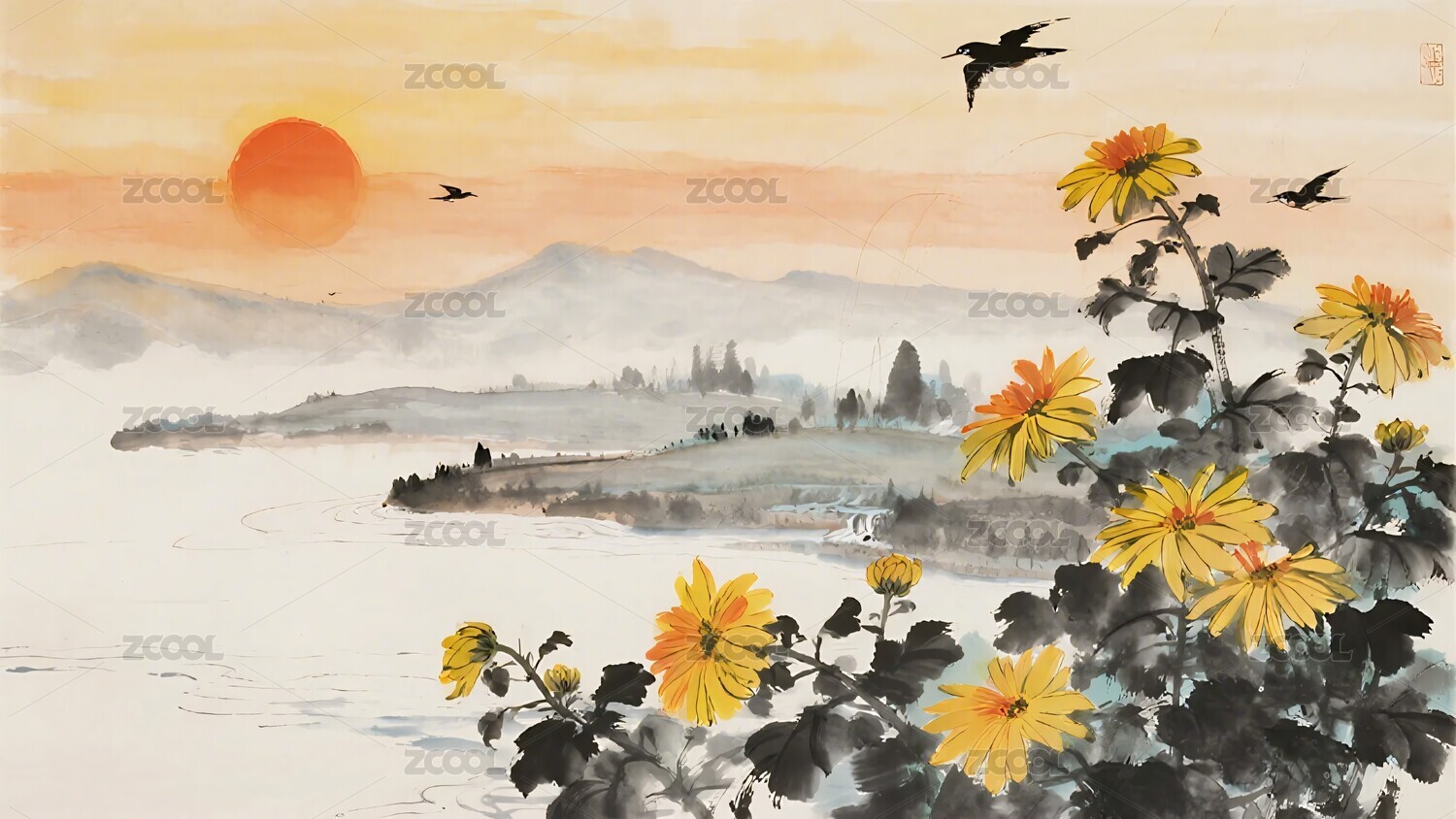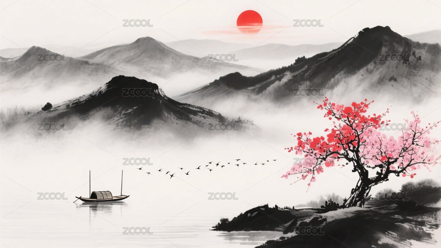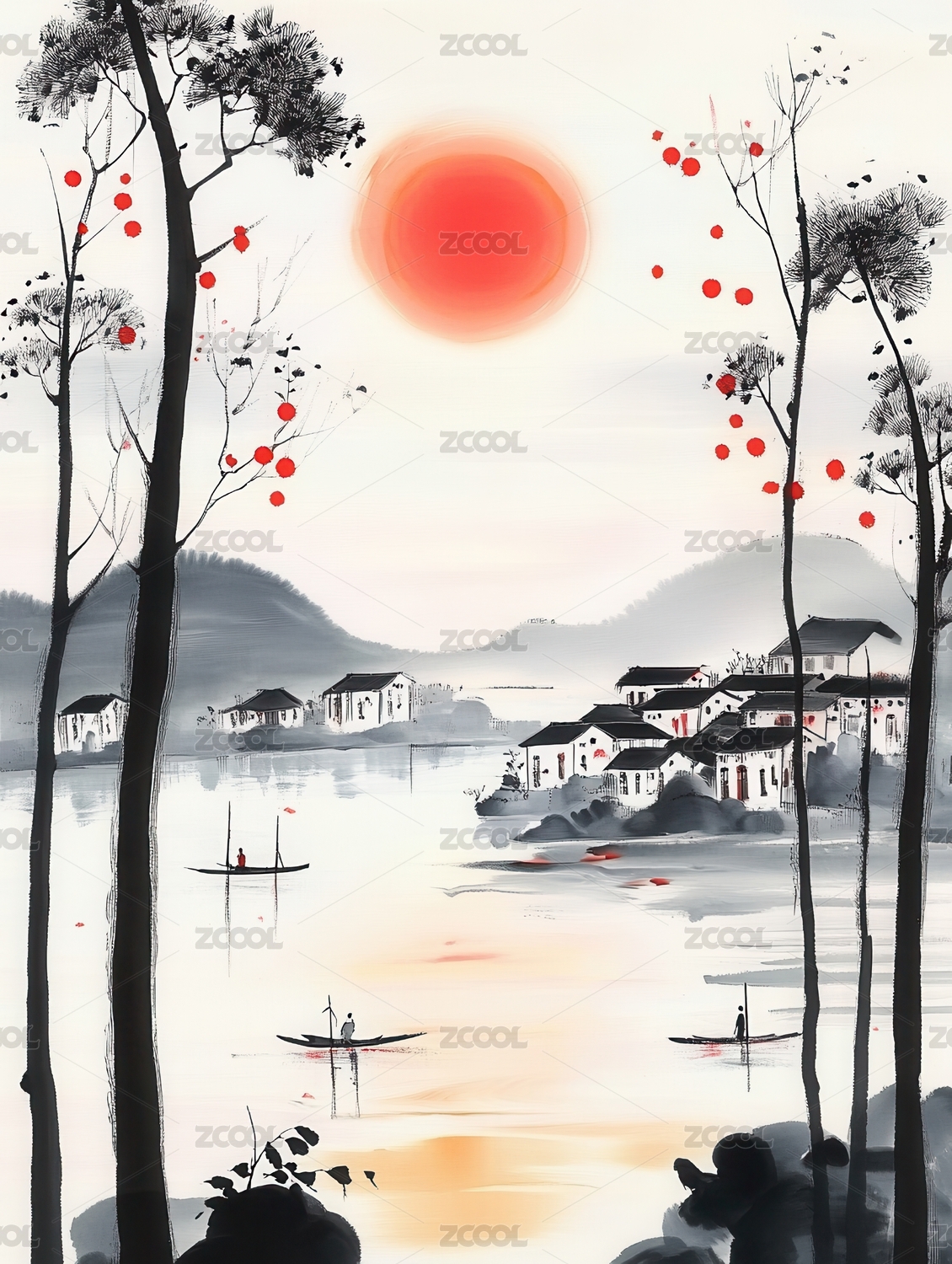 禅意山水画 意境山水花鸟画 水墨花鸟画水墨江南山水画