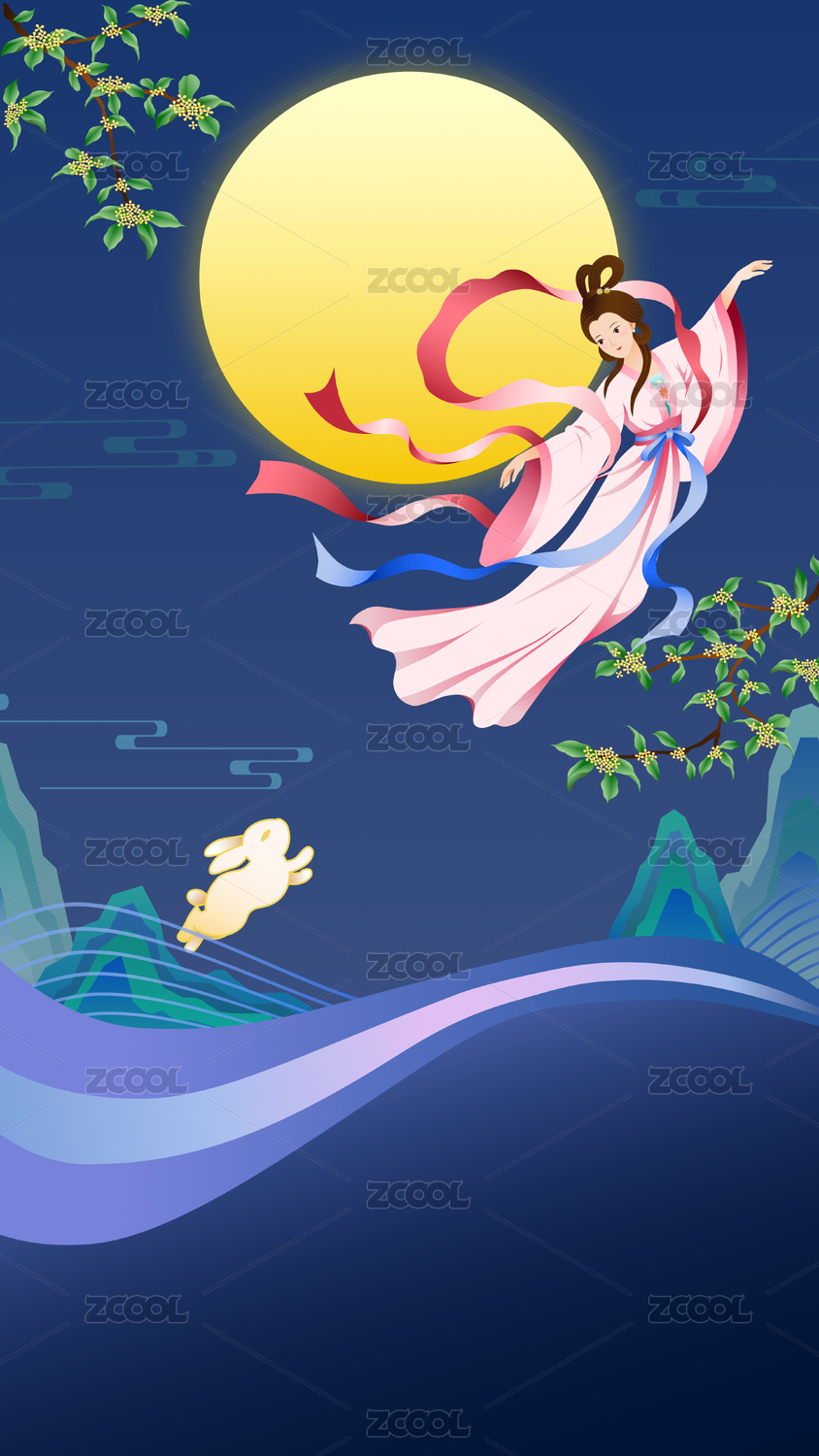 中秋节桂花树下嫦娥奔月玉兔相伴