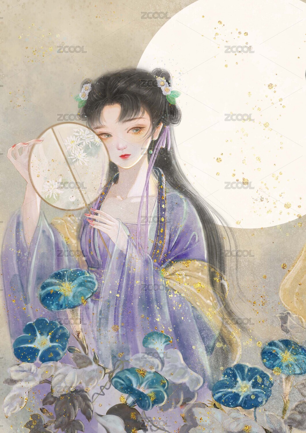 夜晚古风汉服女子中秋月亮下持花灯笼桂花图