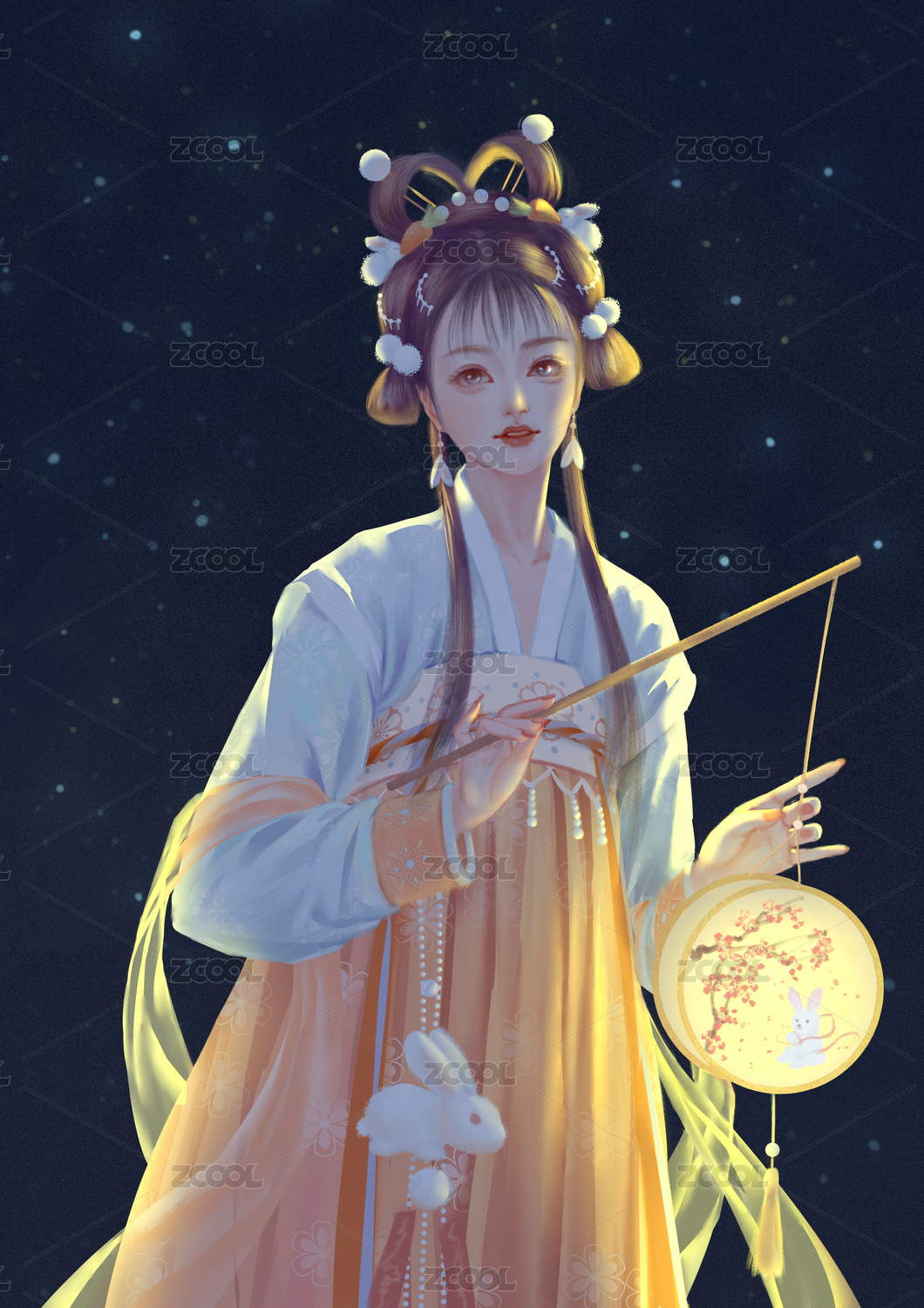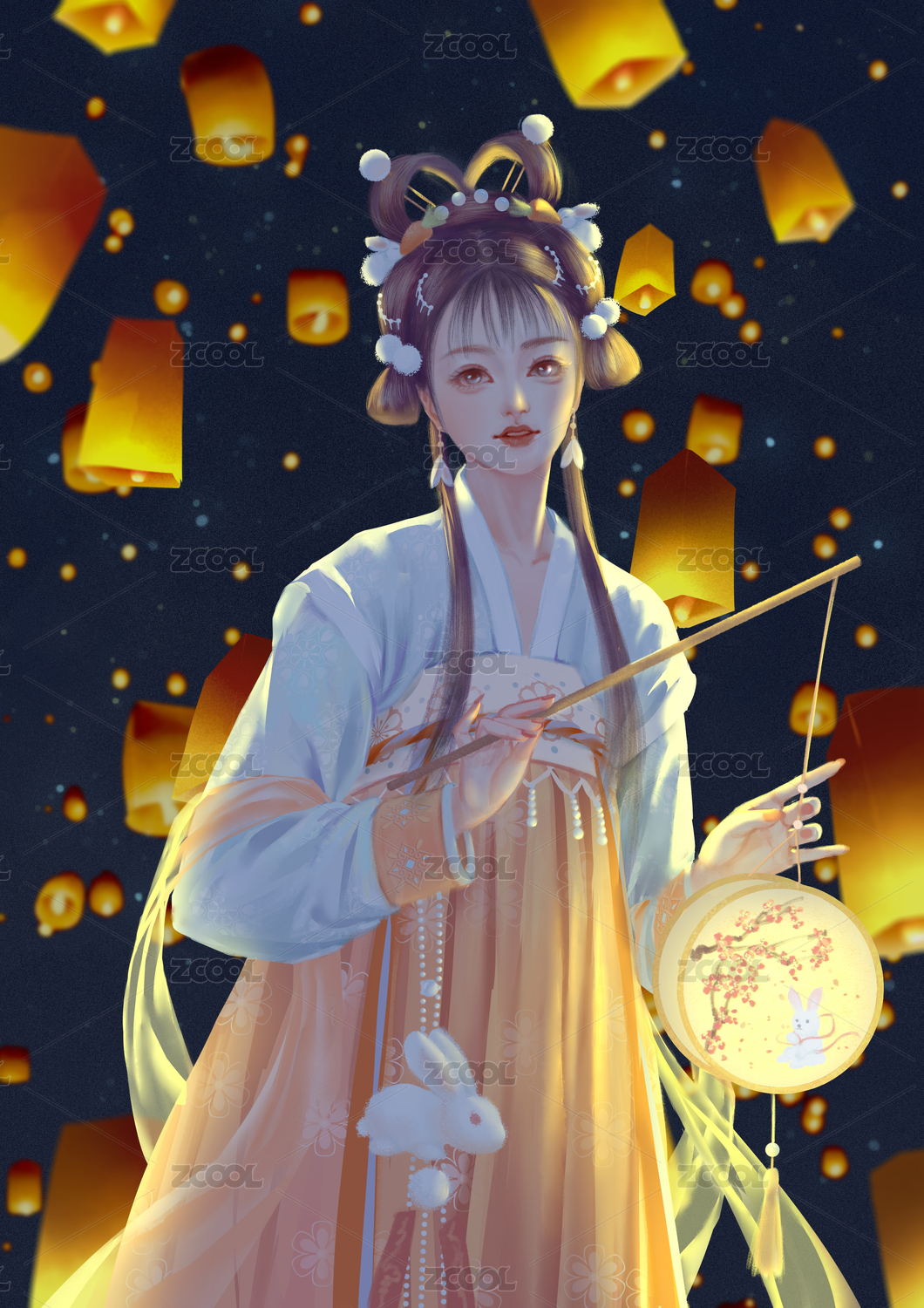 古风汉服女子夜空夜晚下提兔子花灯插画场景