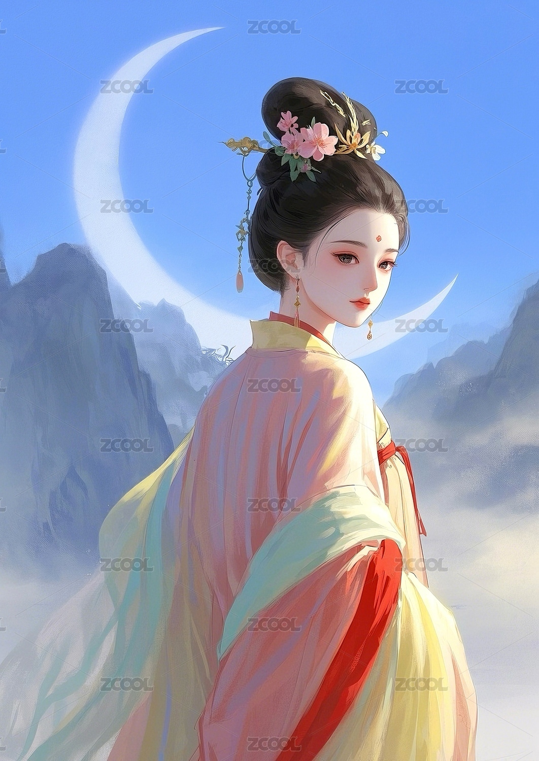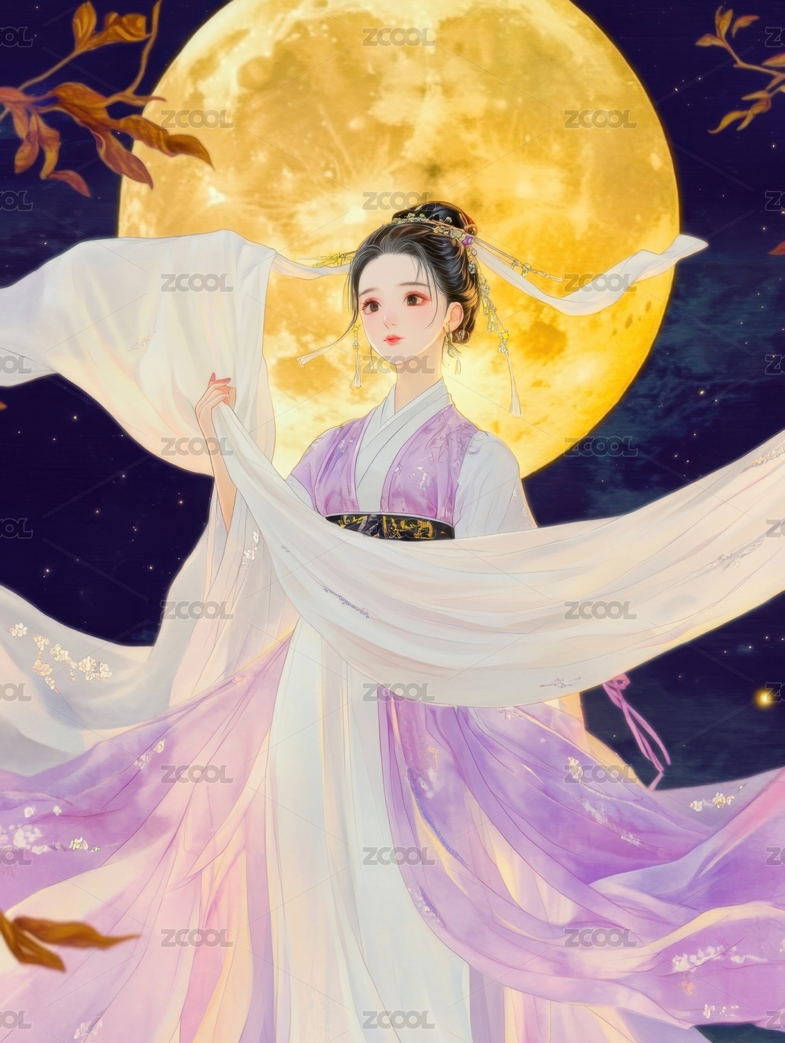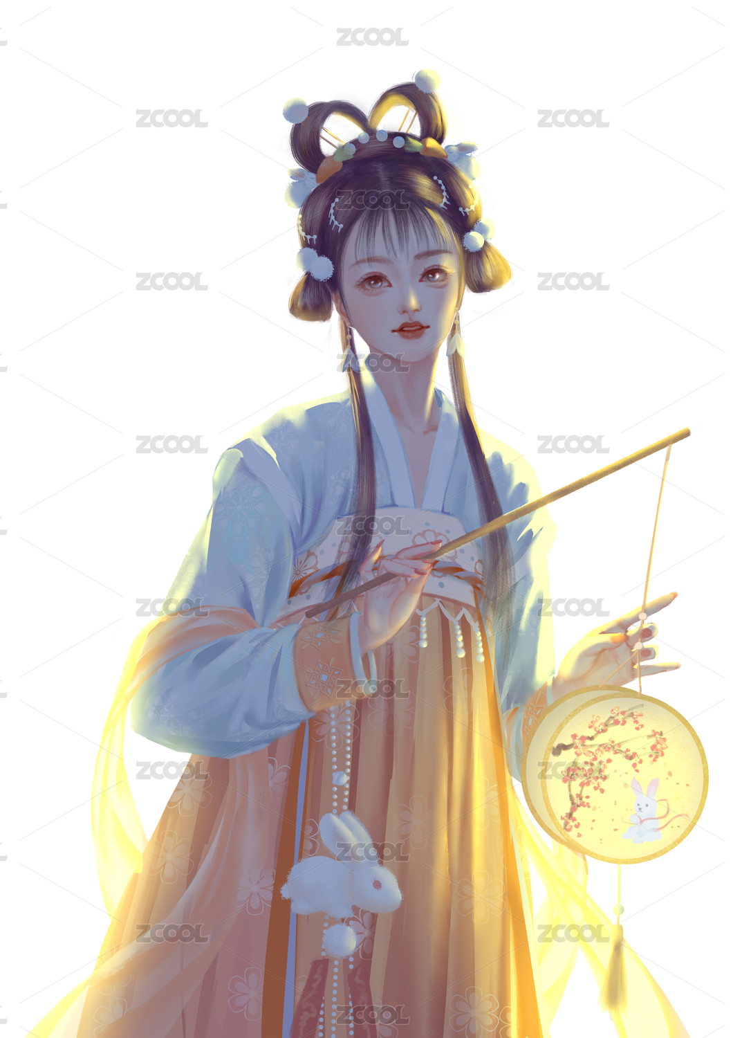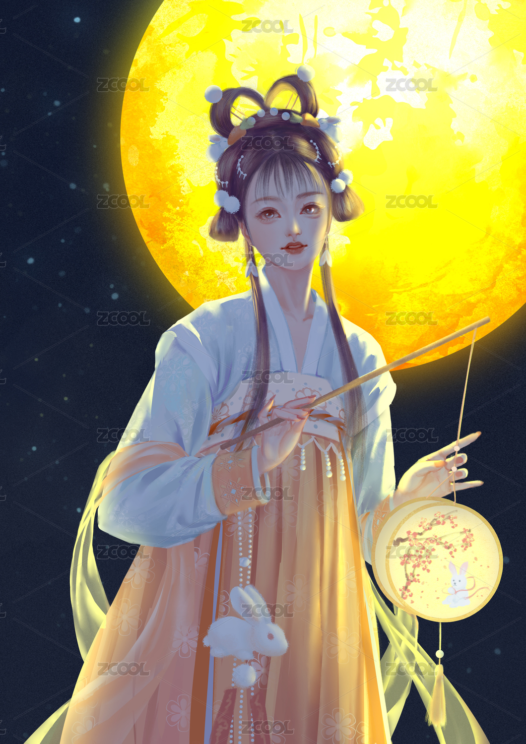 夜晚圆月亮之下古风汉服女子提兔子花灯笼图