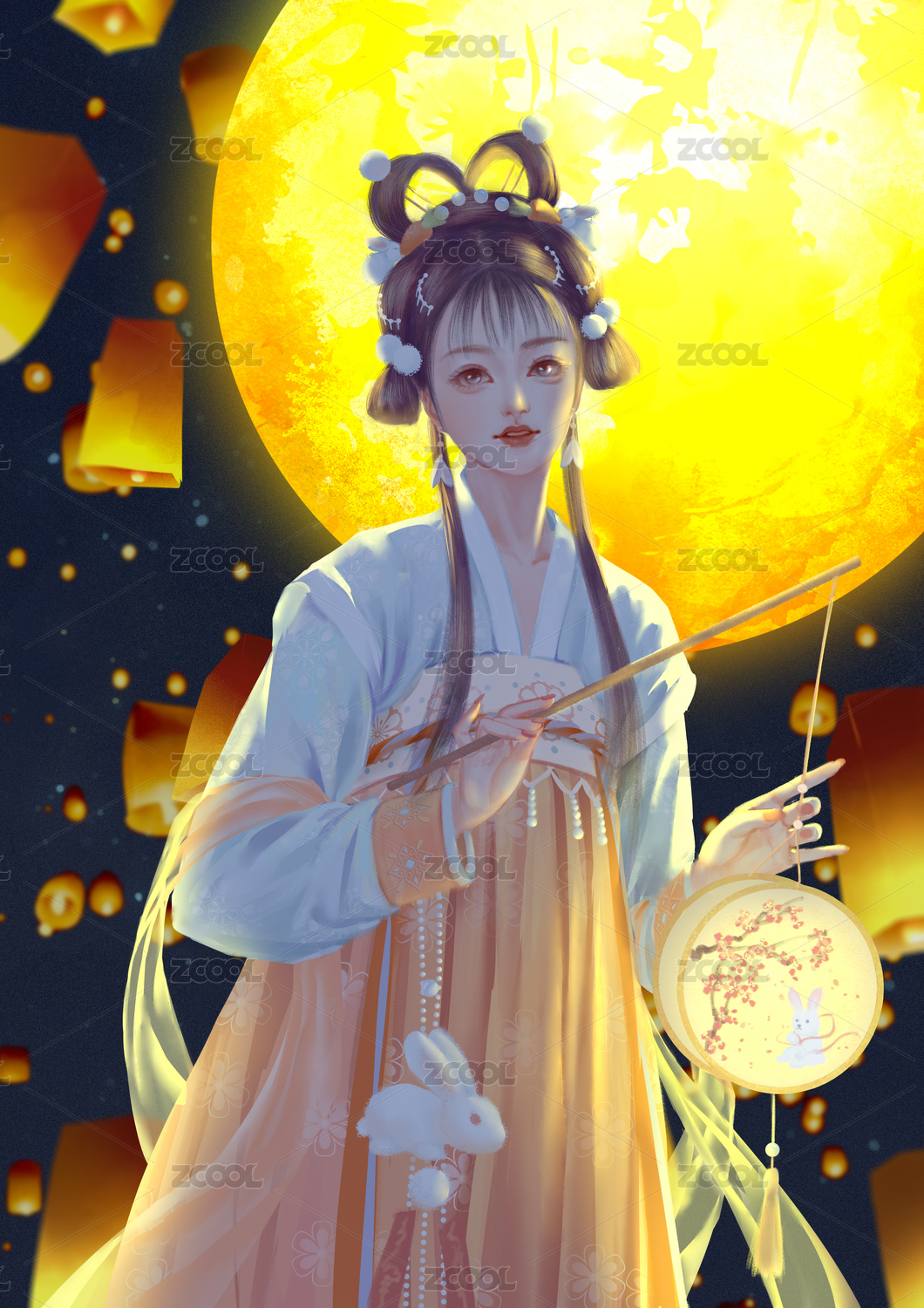 中秋节圆月亮孔明灯下古风汉服女子提兔灯笼