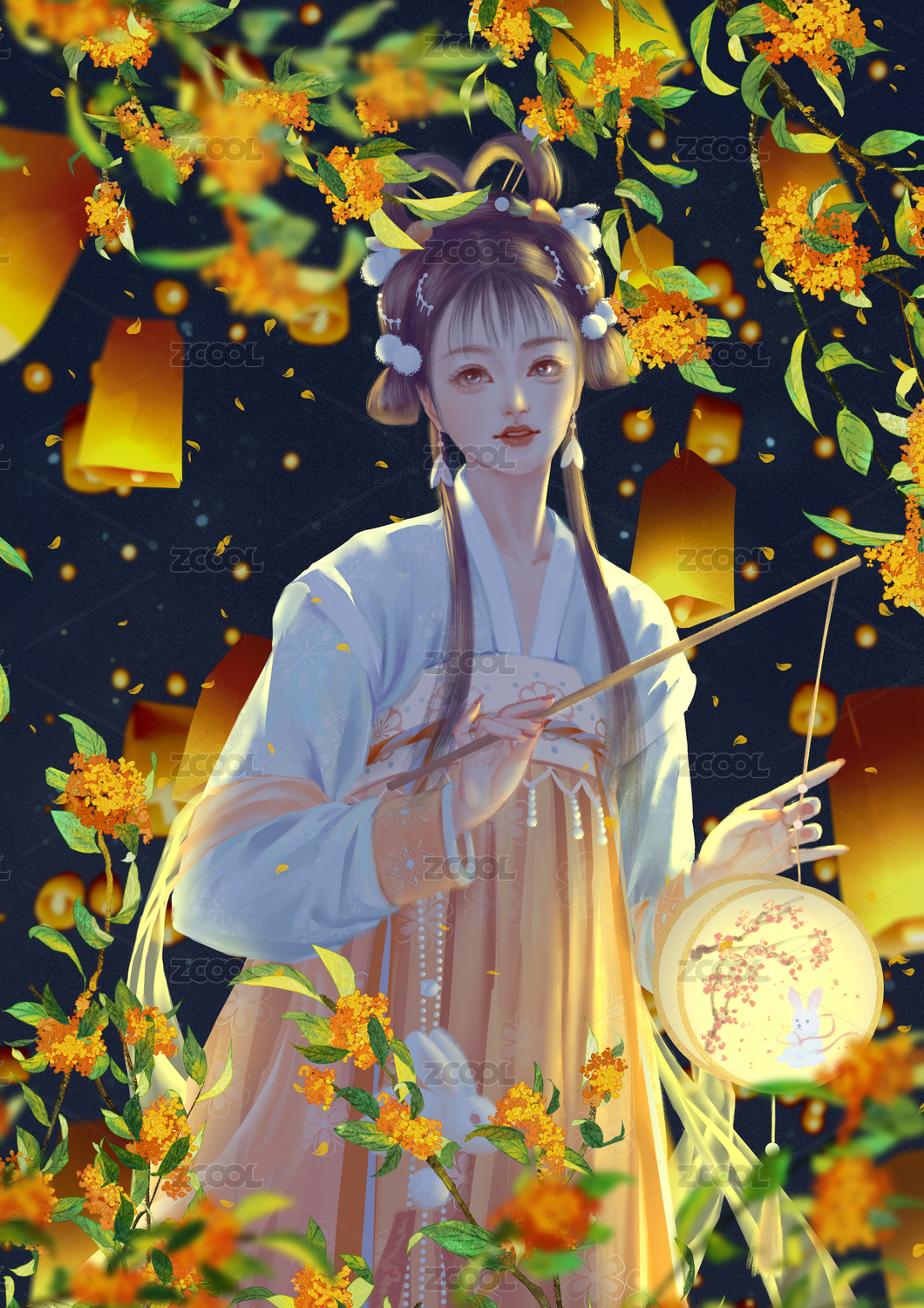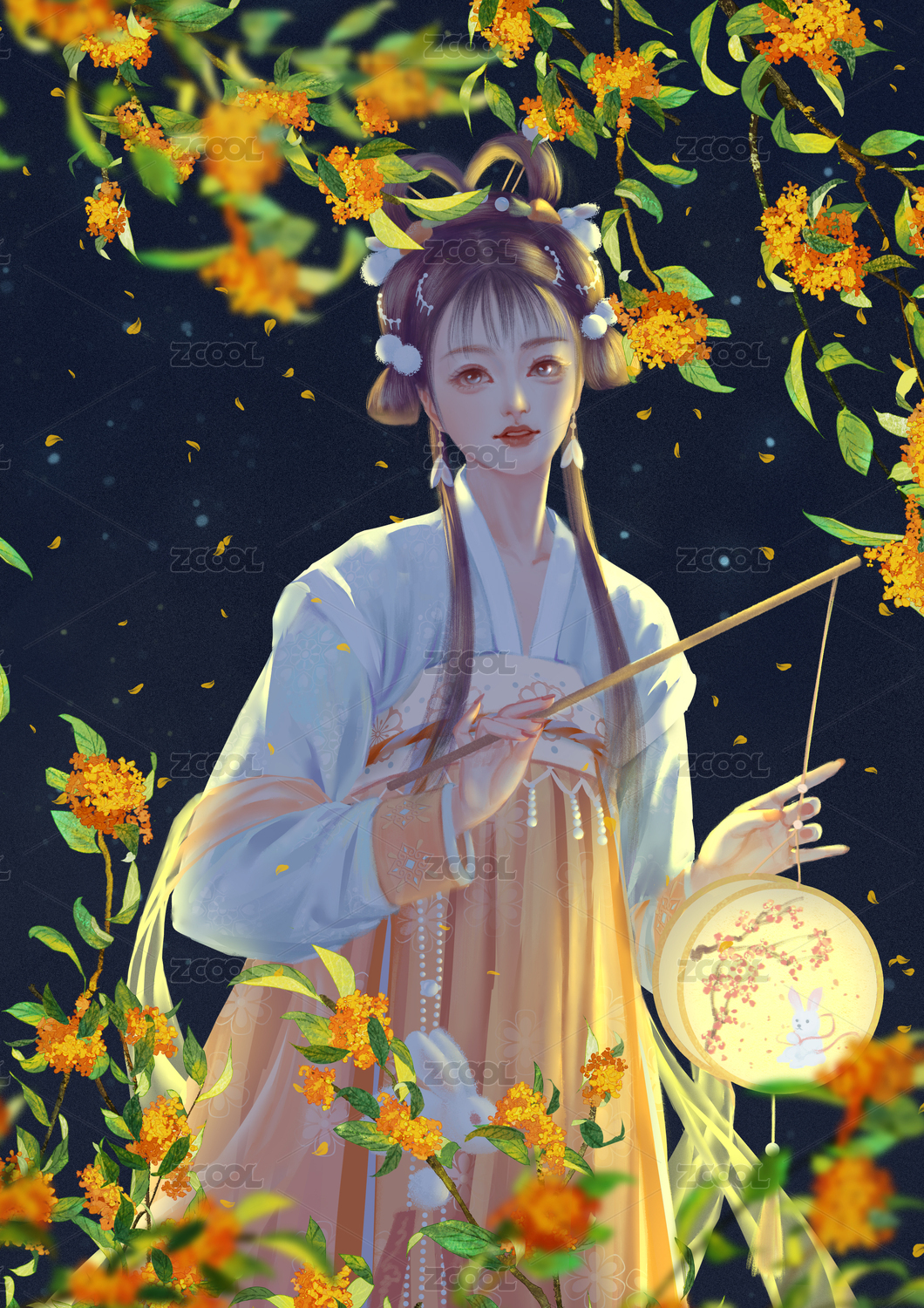 夜晚星空桂花树下古风女子提兔子花灯笼图