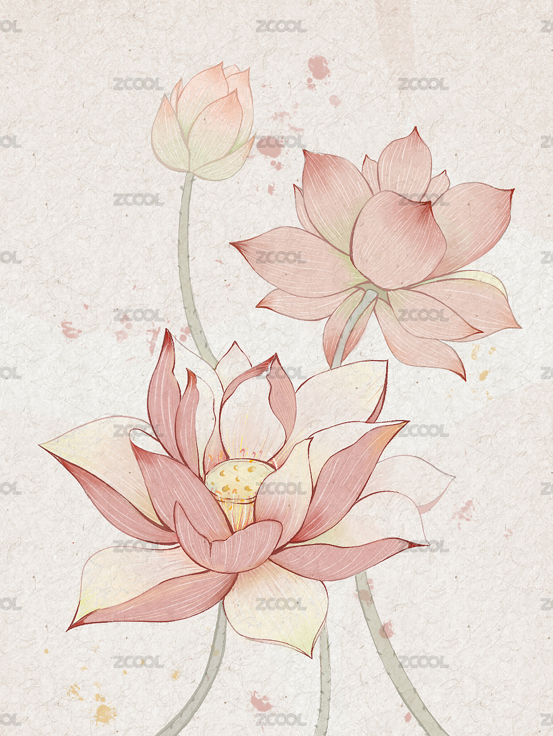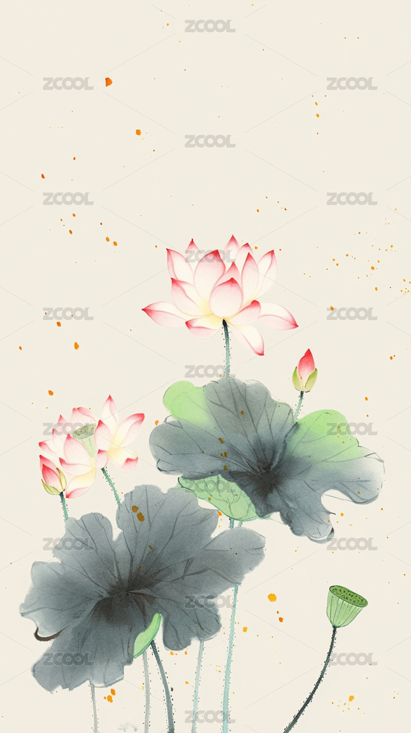 中国风水彩淡墨质感莲花荷花荷叶组合插画