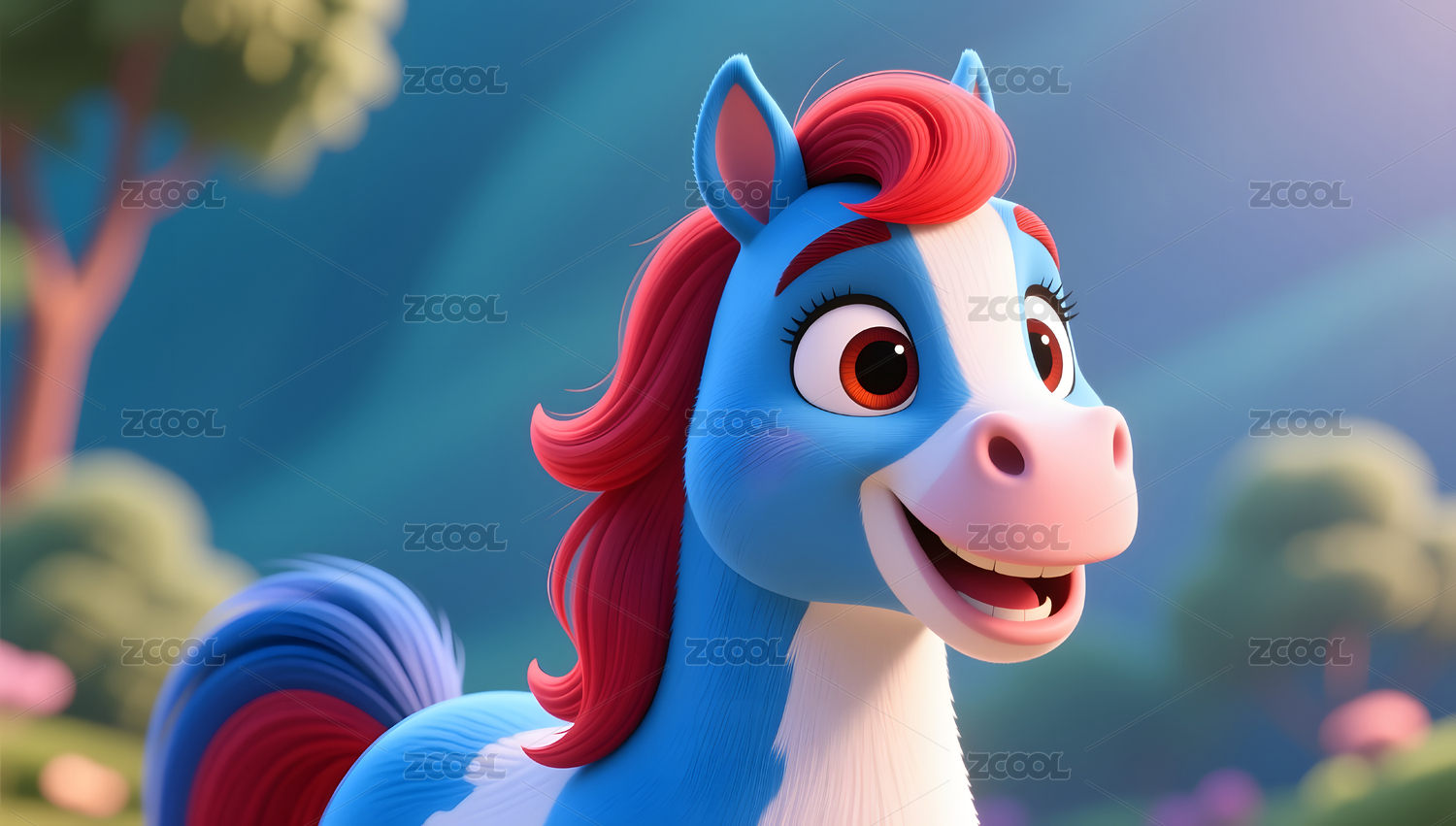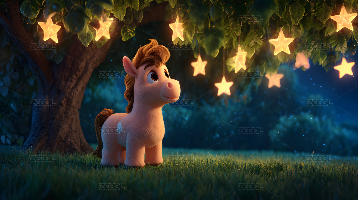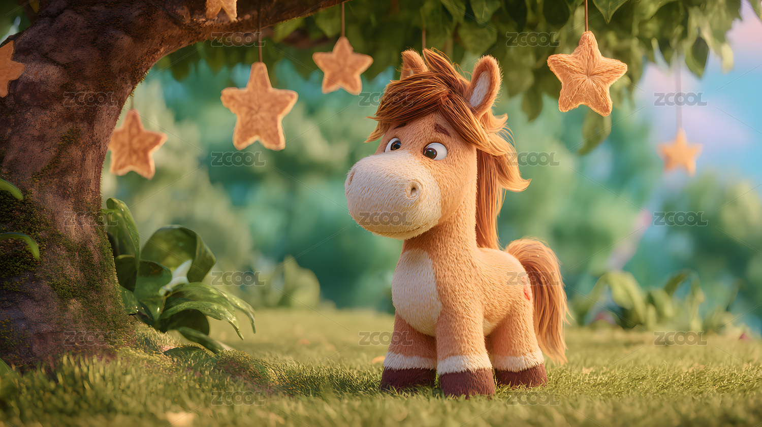 大树,树木,草地,小草,马,卡通,形象,3D,立体,玩耍