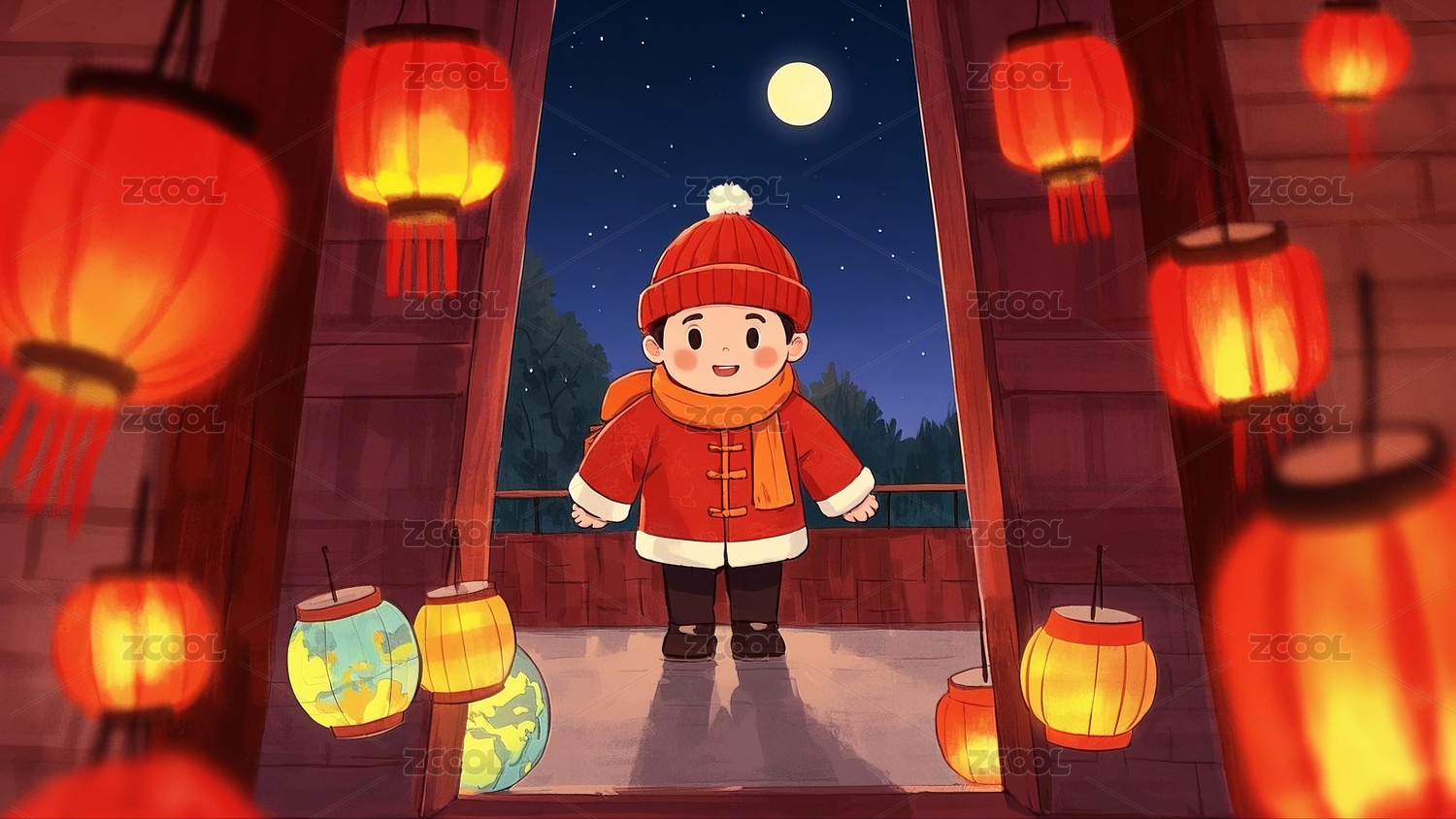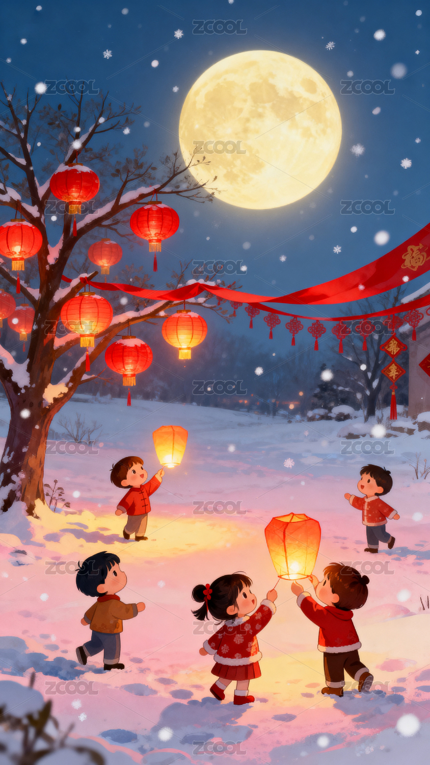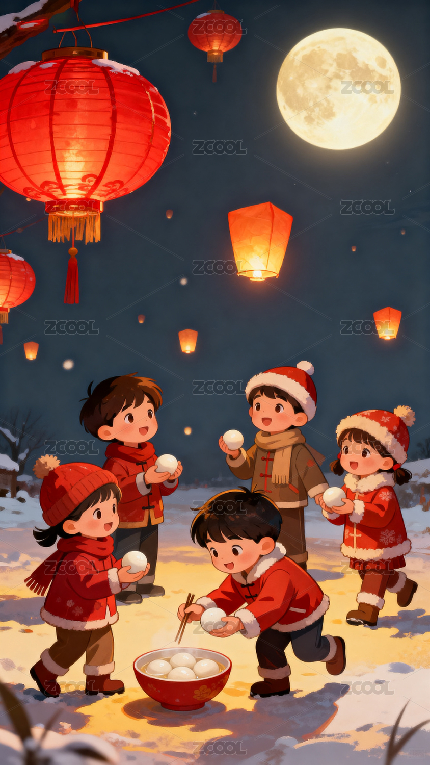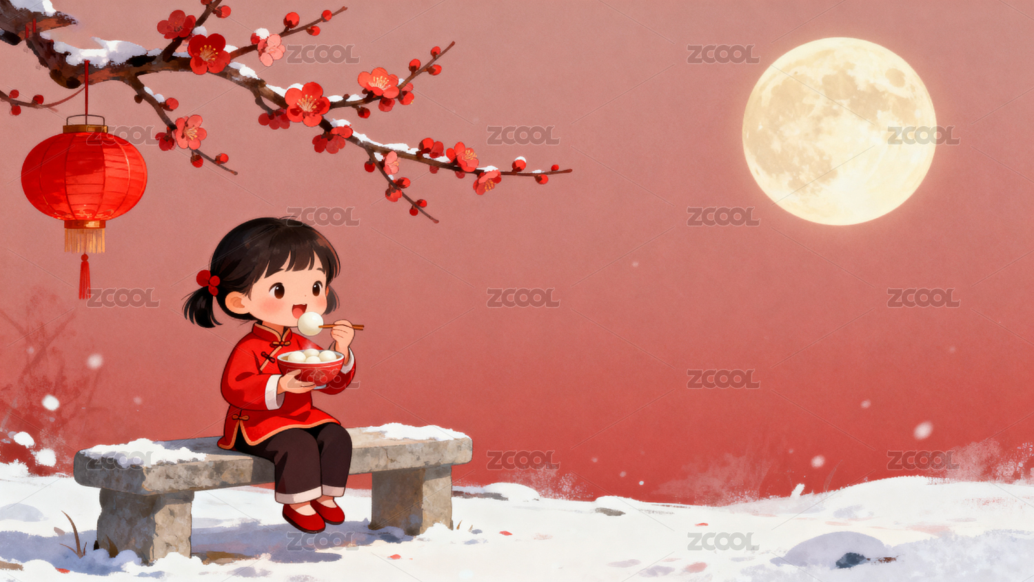 汤圆,梅花,碗,红色,节日,传统,女孩,夜空,月亮,雪