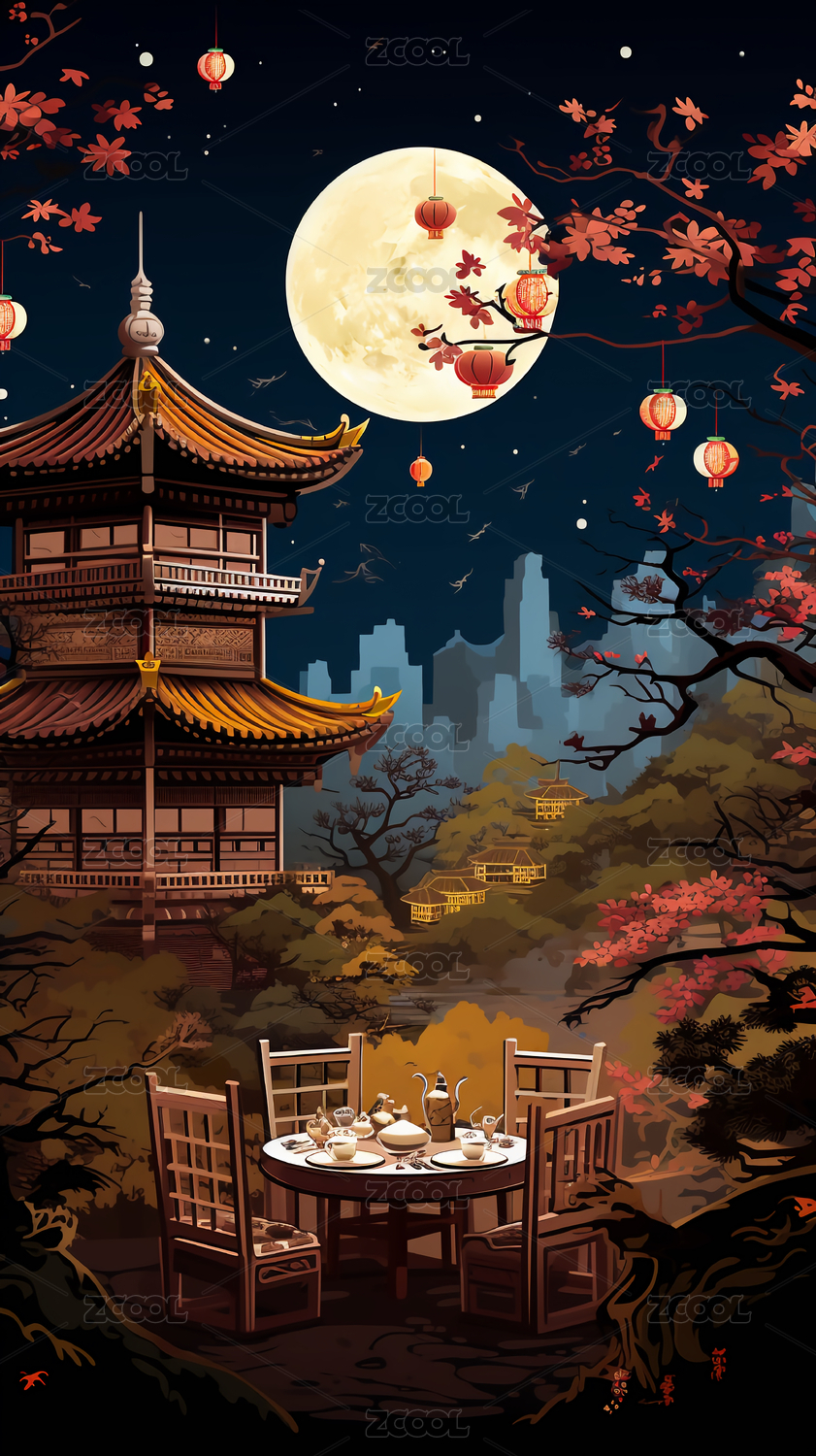 氛围,月亮,倒影,灯光,传统,节日,光影,建筑,温馨,户外
