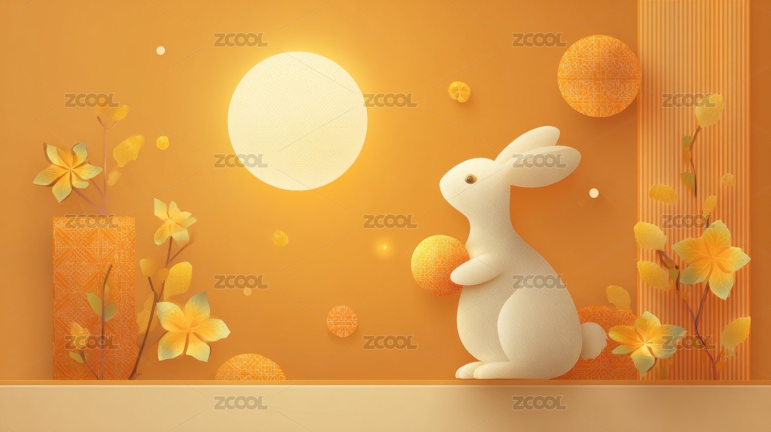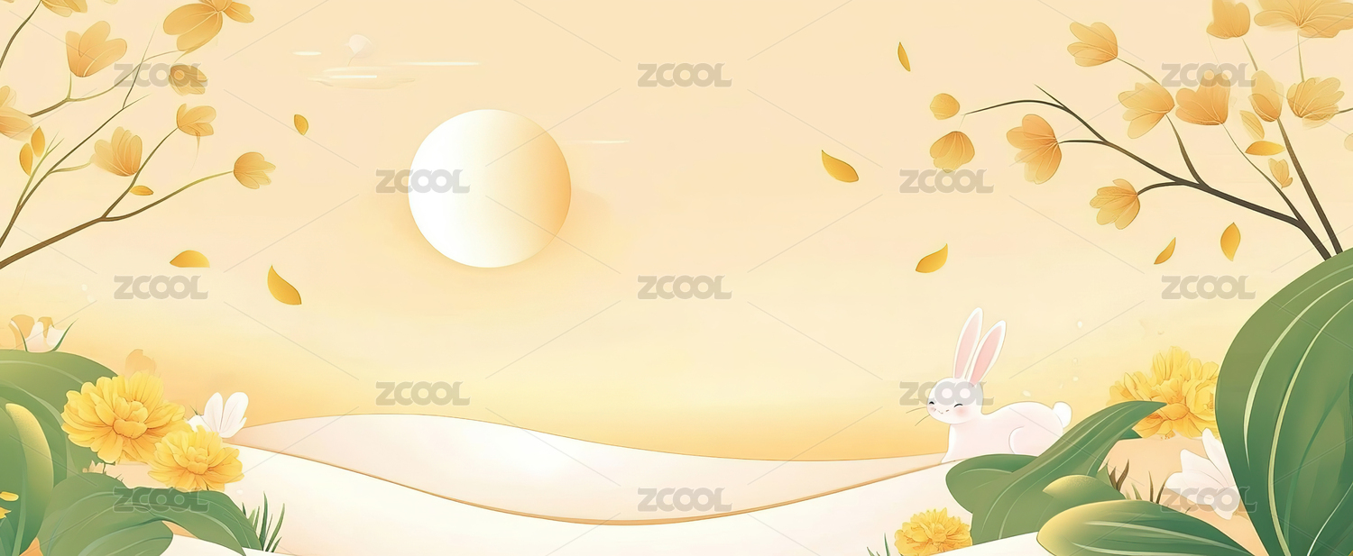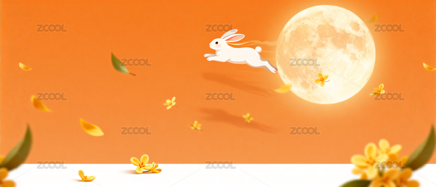 中秋节橙黄色调月亮玉兔桂花丝带飘带背景