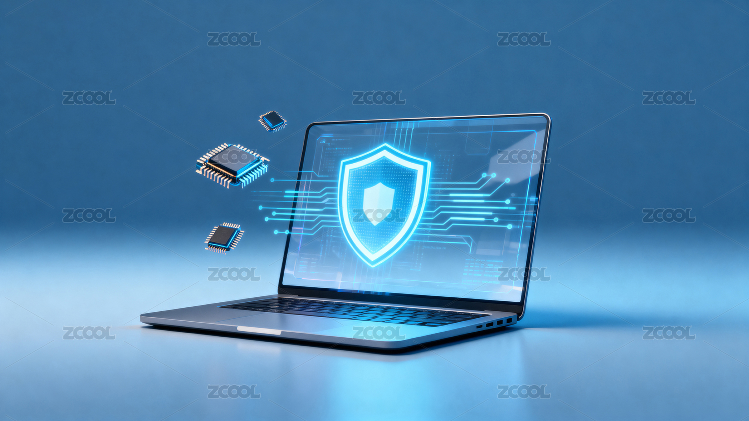 笔记本电脑屏幕显示安全盾牌与芯片