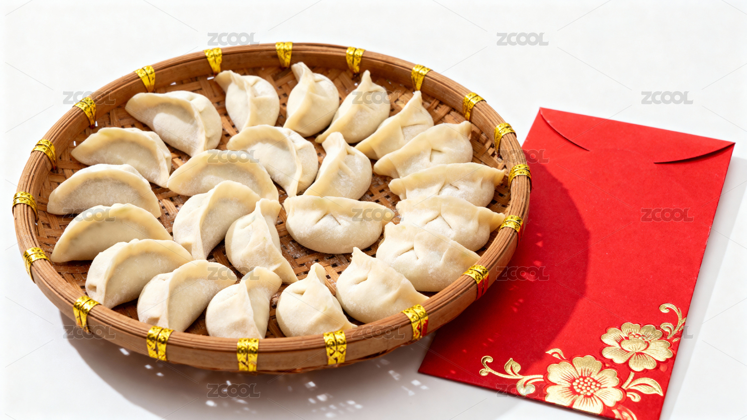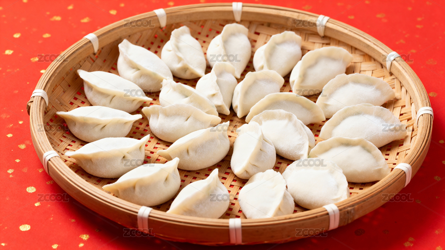 竹篮盛放饺子红底衬托