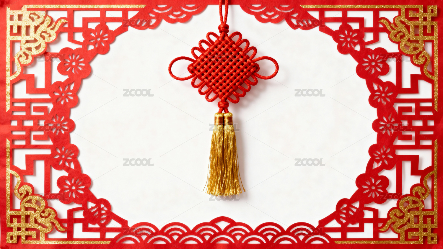 红色中国结挂饰与剪纸边框