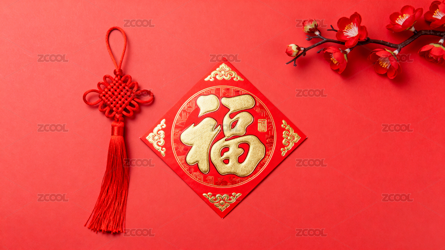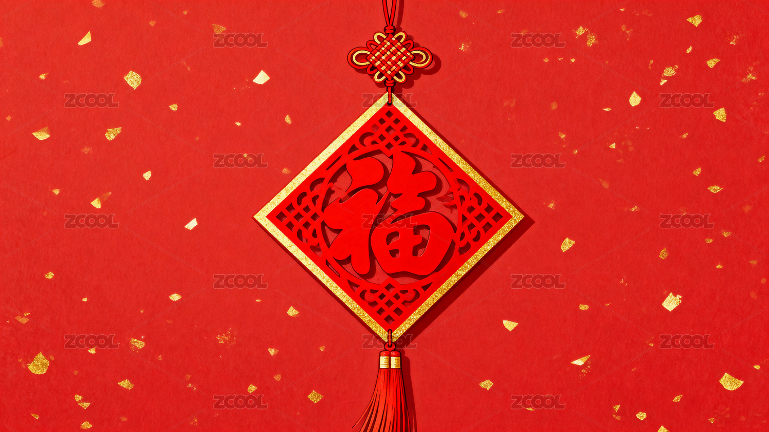 红色背景上的福字剪纸与中国结