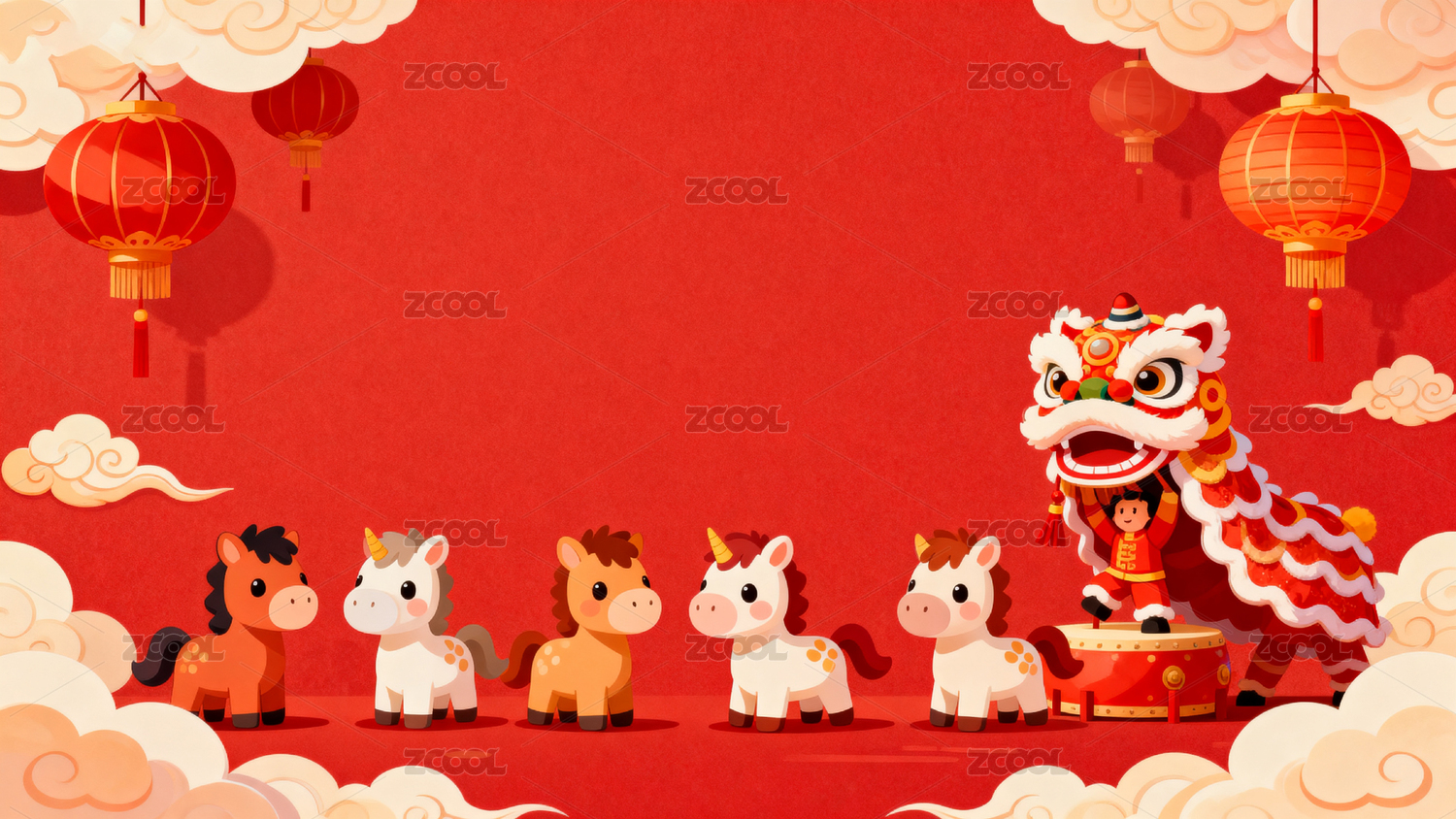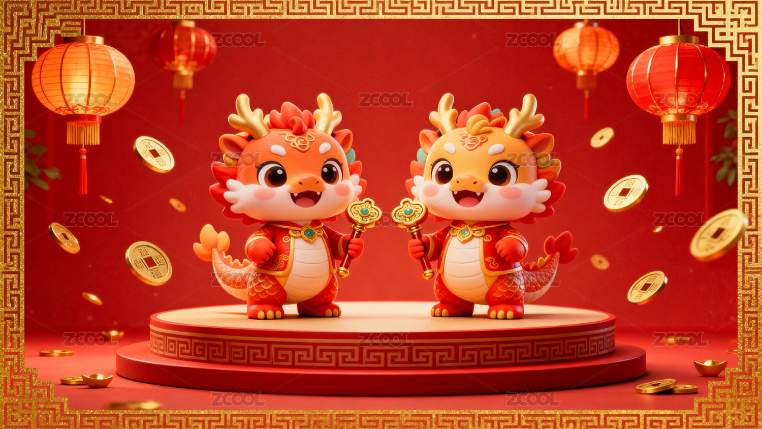 国潮新年一只龙坐在锦鲤上和扇子灯笼背景