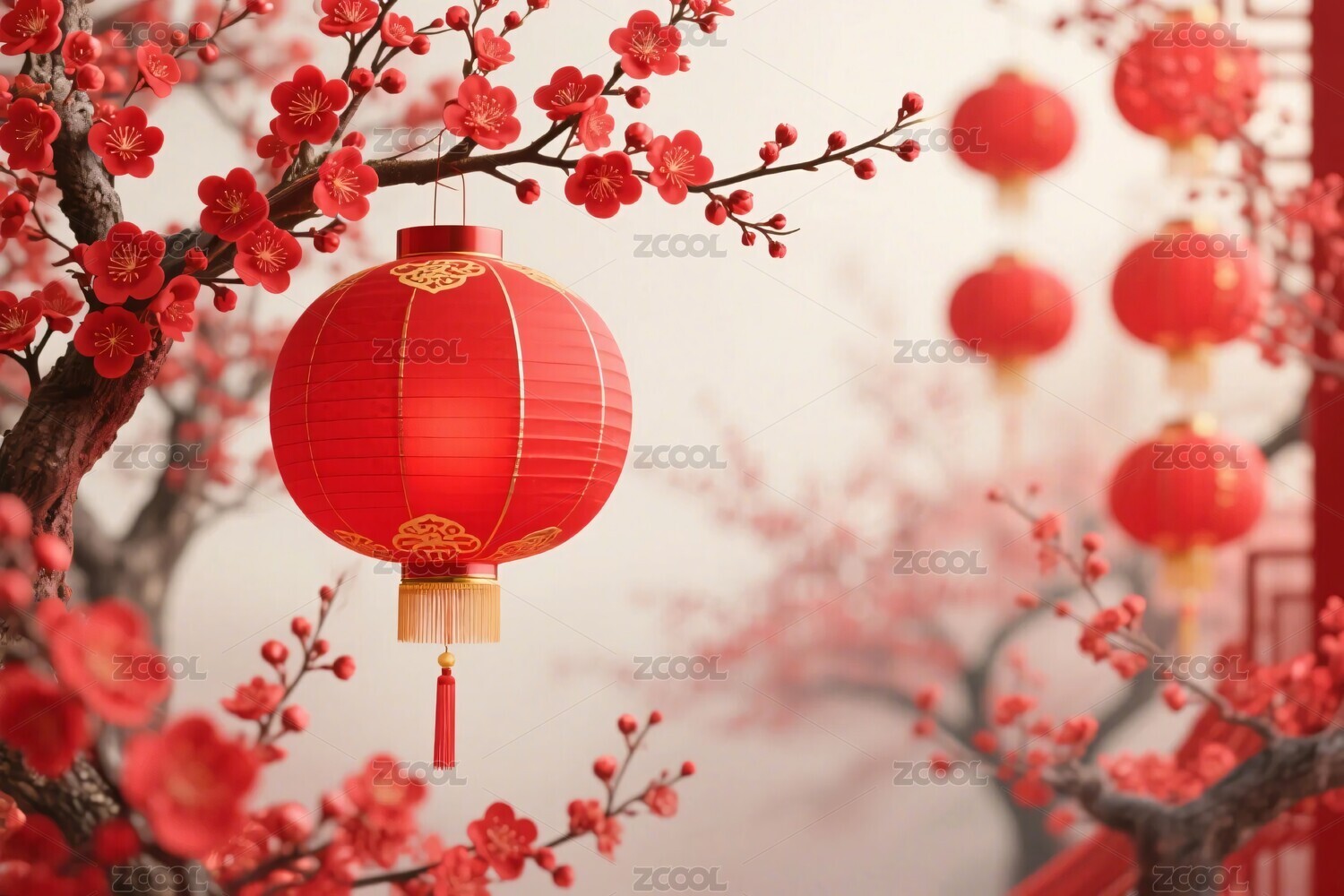 红色灯笼与梅花枝节日装饰