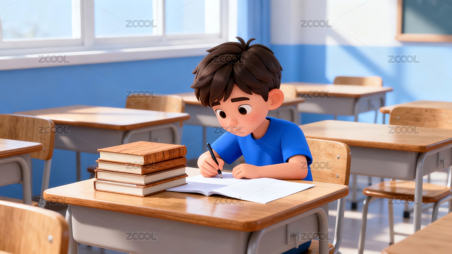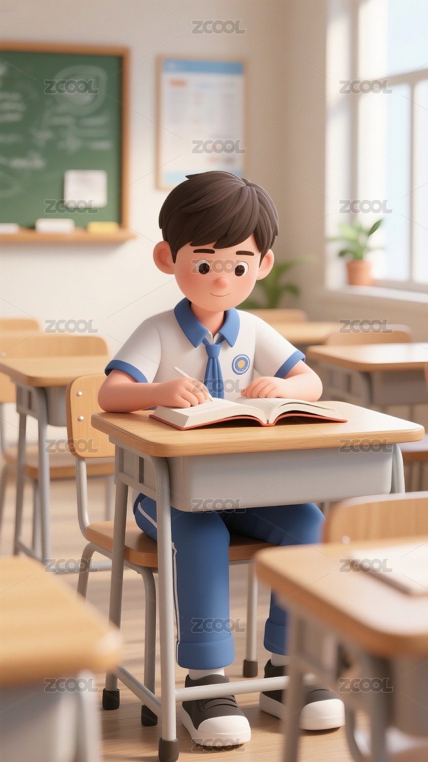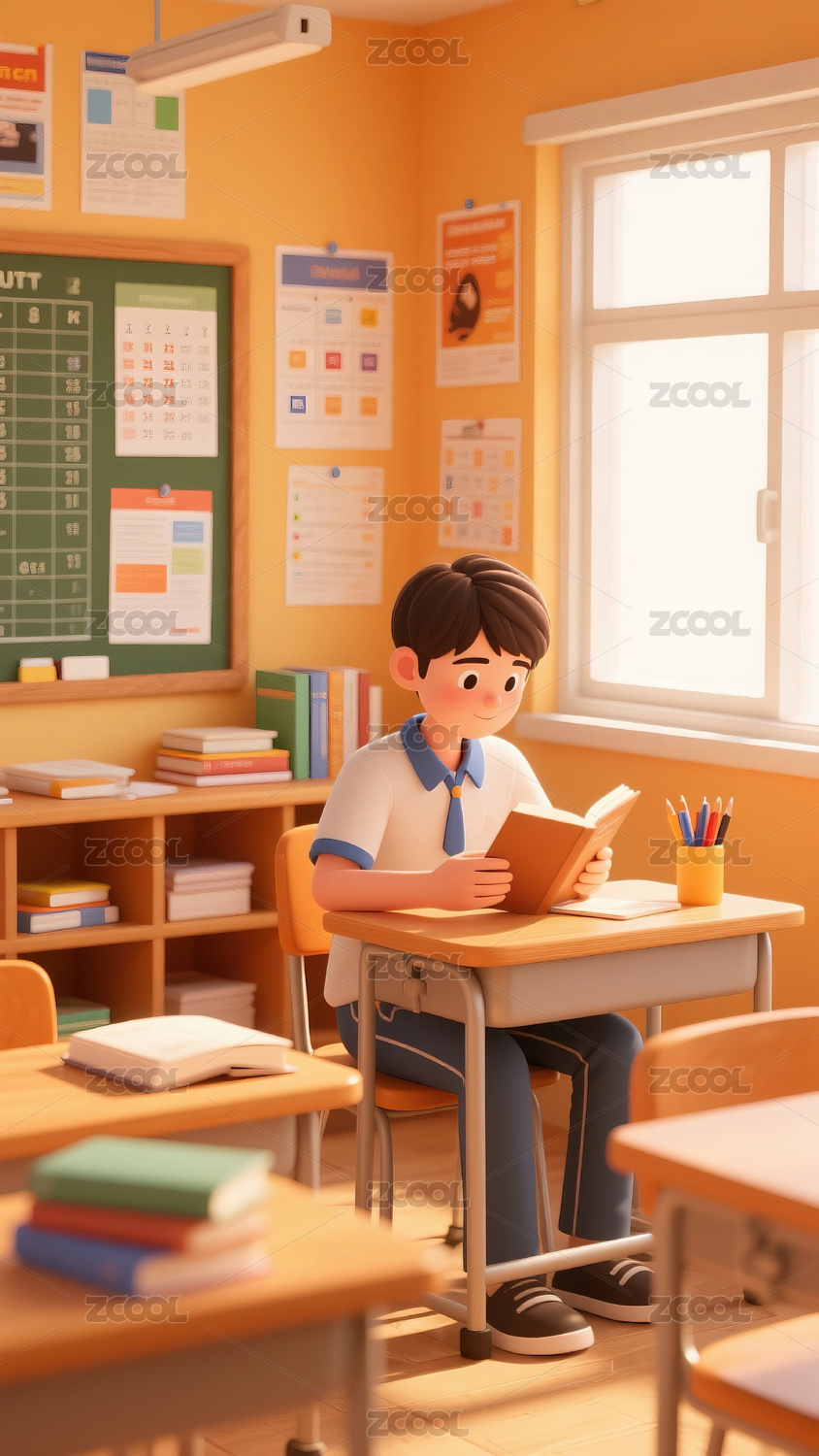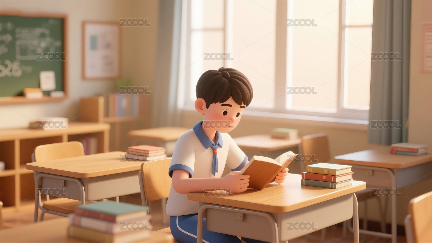3D,三维,男孩,学校,学习,学生,教室,书桌,阅读,看书