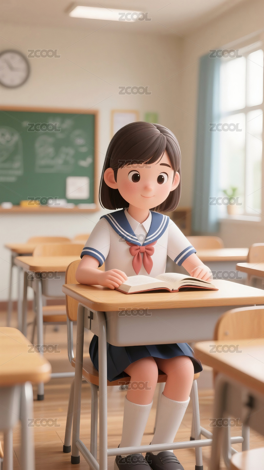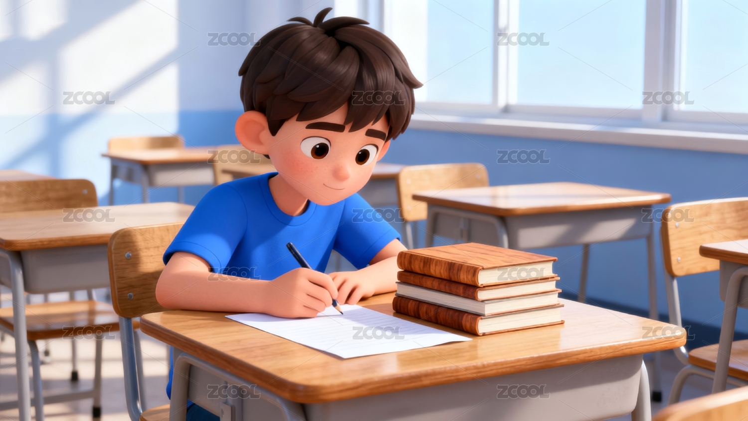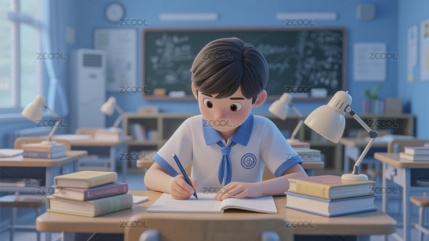 3D,三维,男孩,学校,学习,学生,教室,书桌,阅读,看书