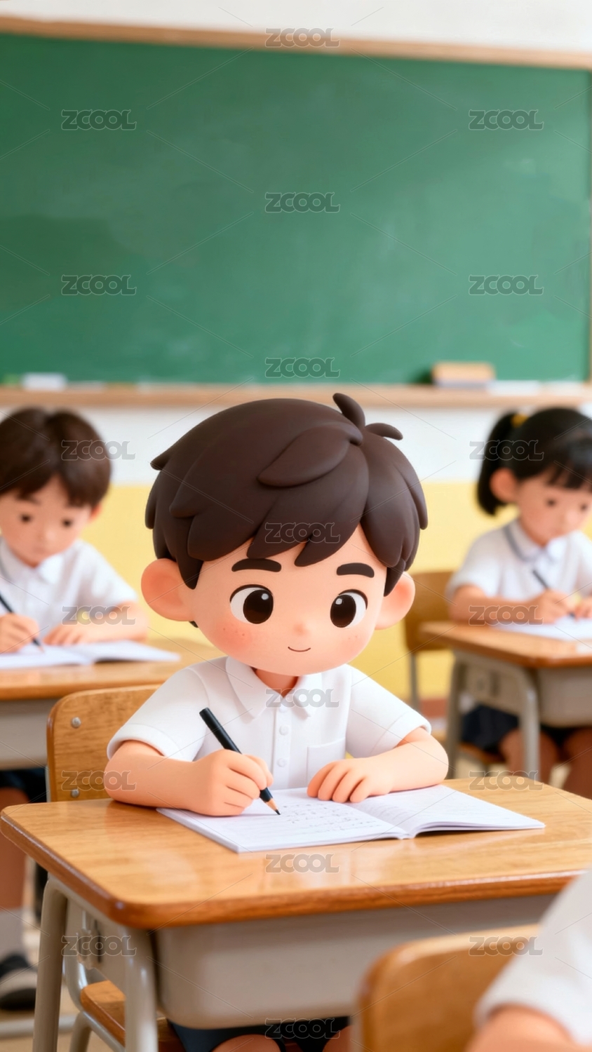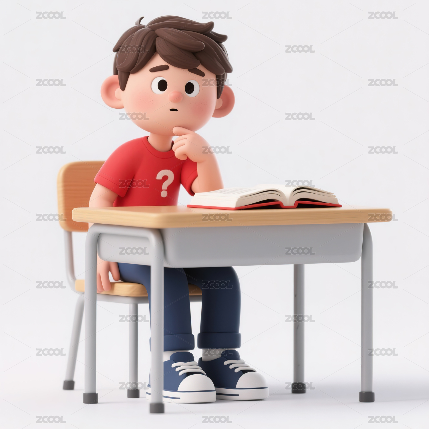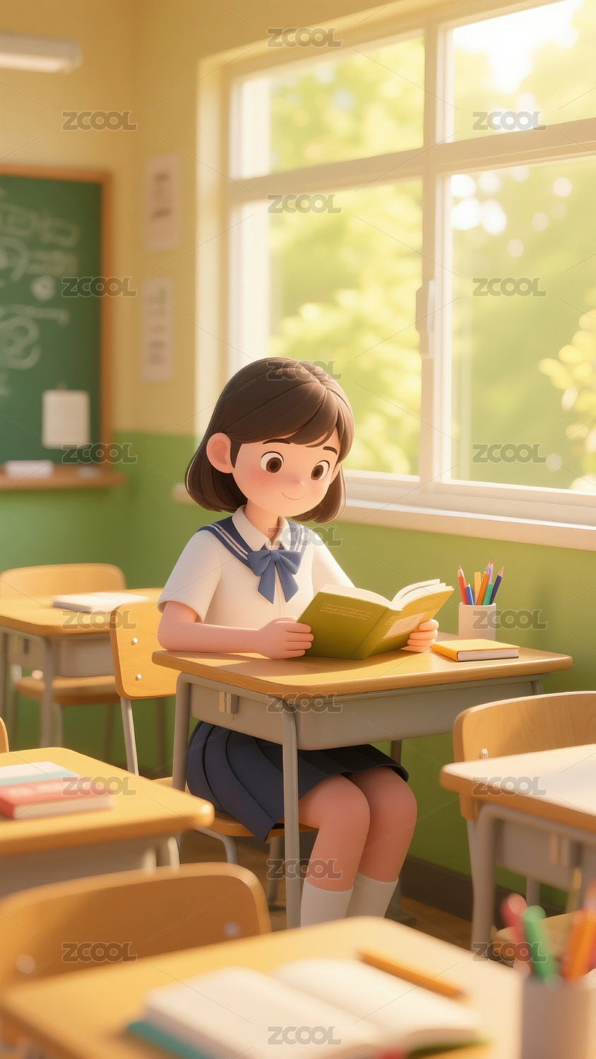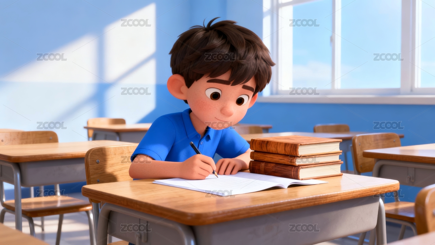 3D,三维,男孩,学校,学习,学生,教室,书桌,阅读,看书