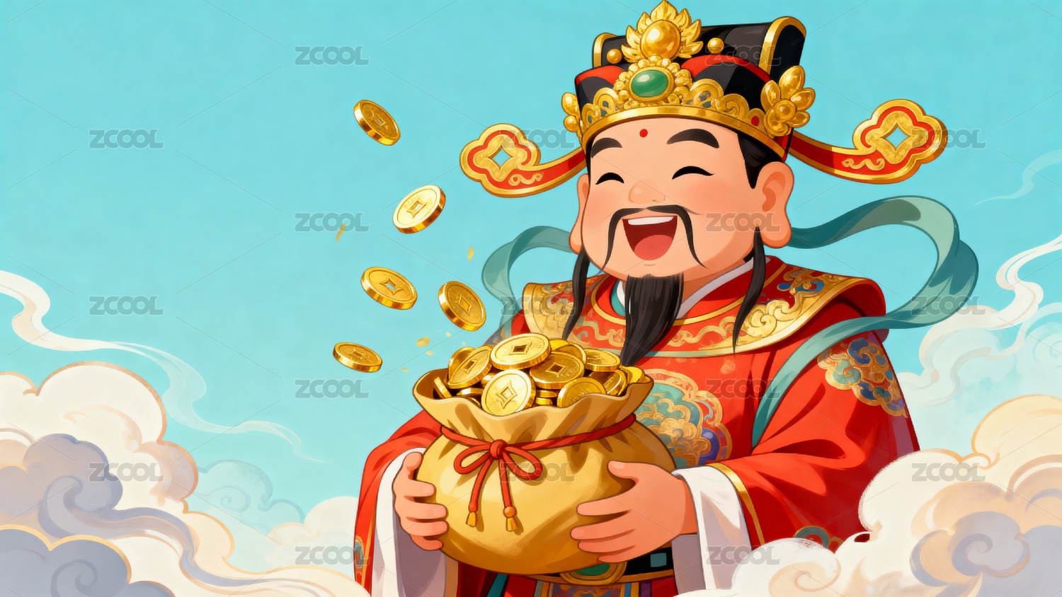 财神爷怀抱金元宝喜迎新年