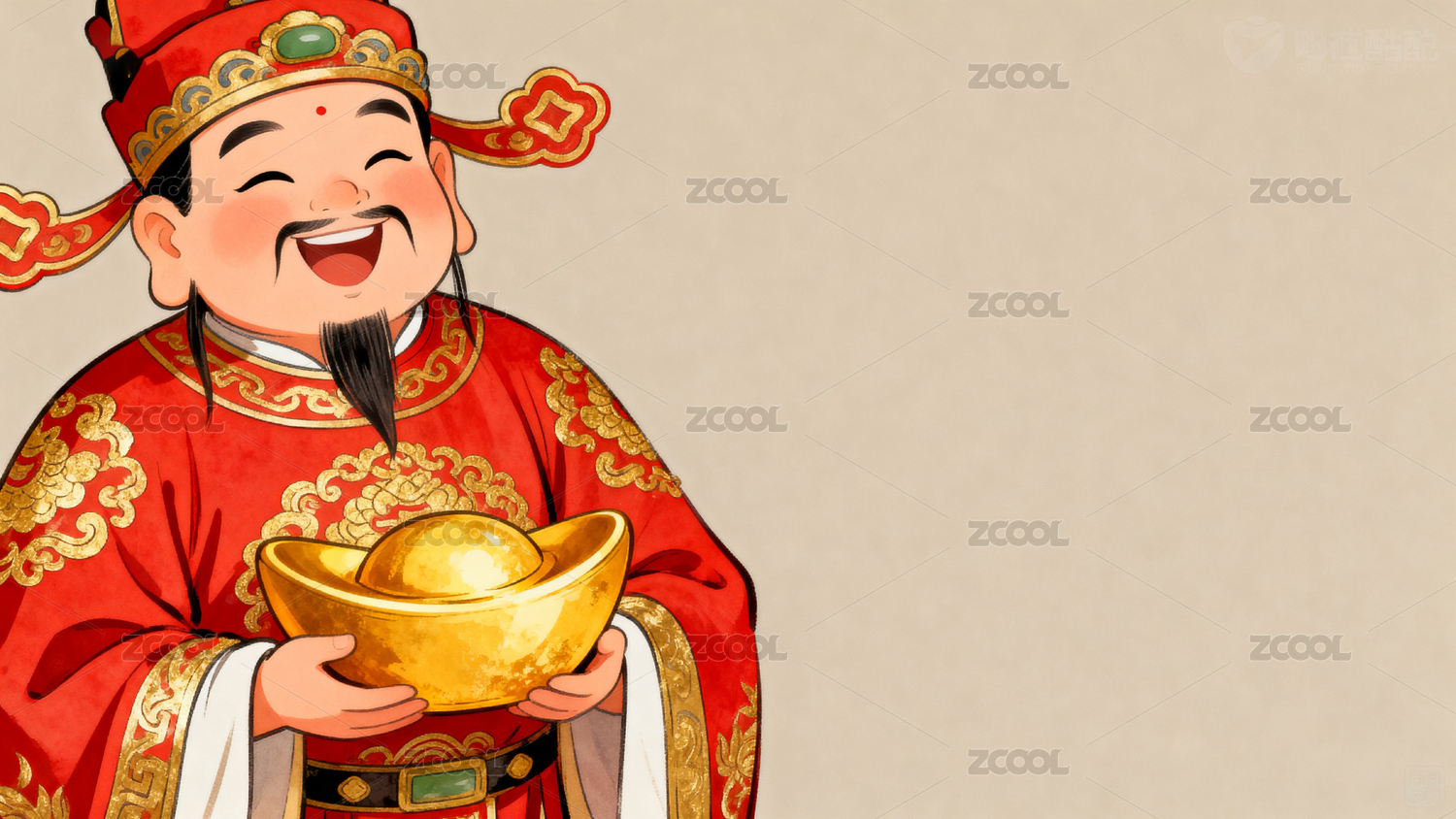 财神爷手持金元宝与毛笔