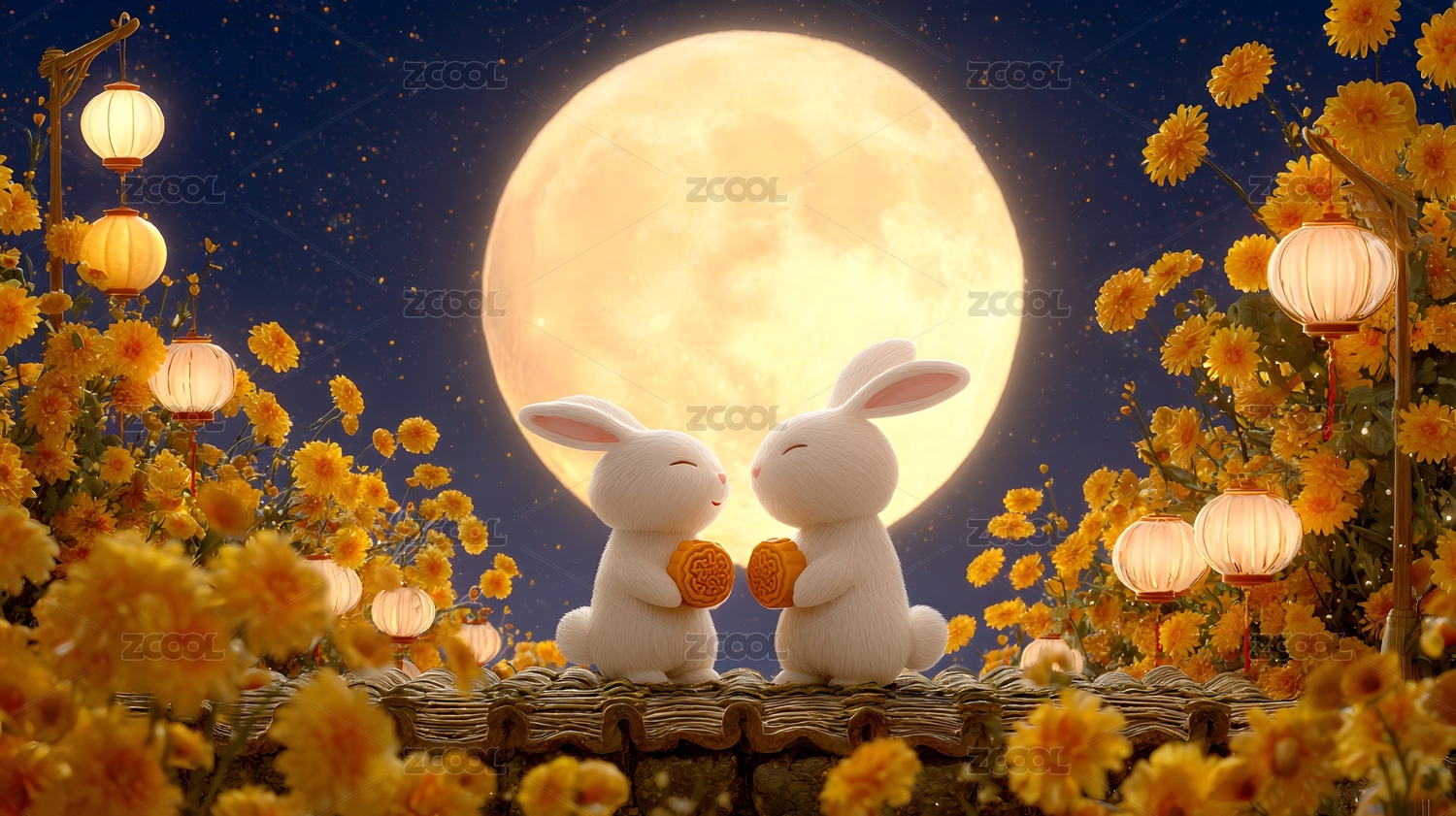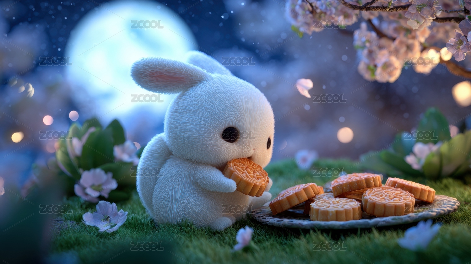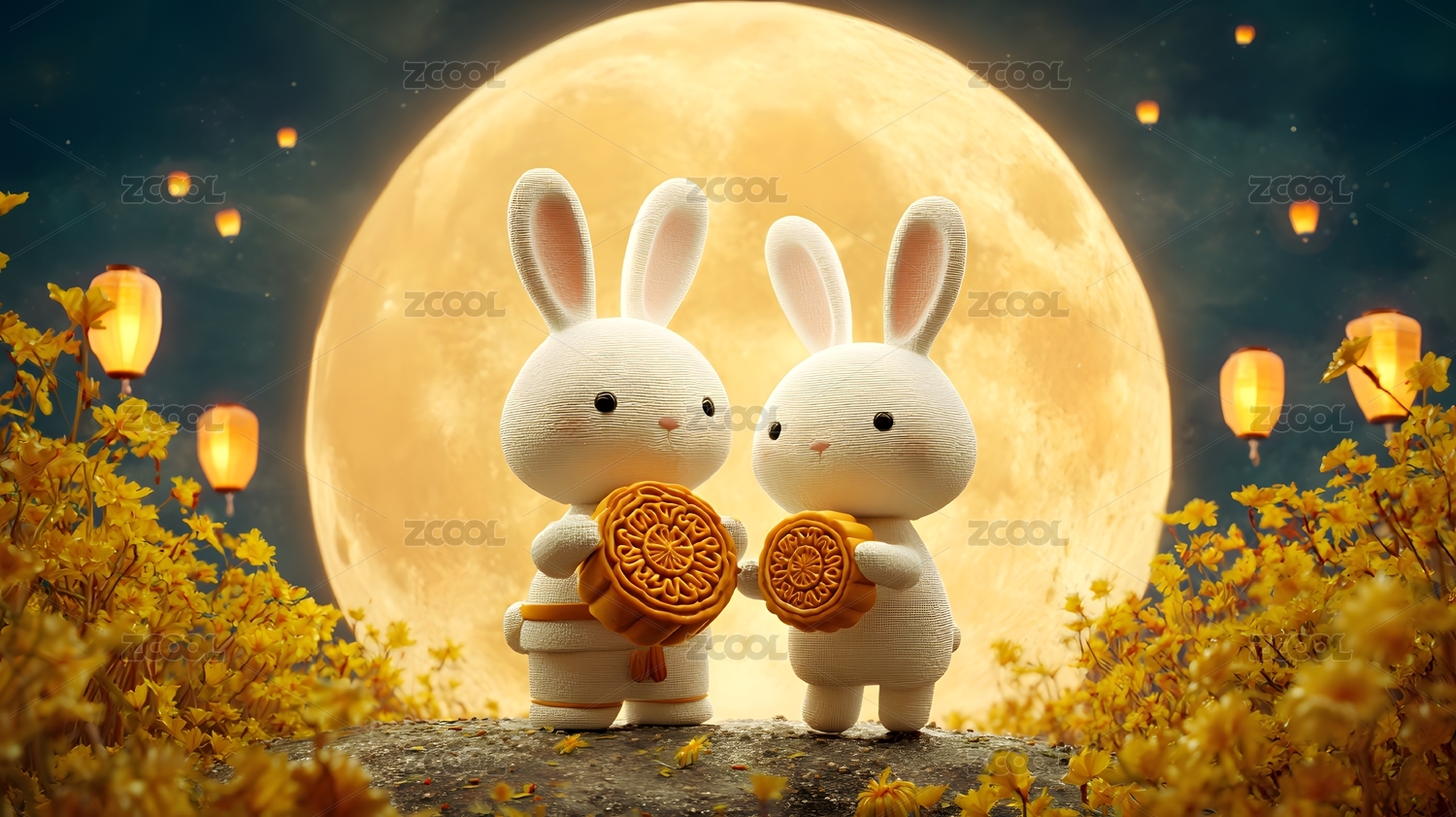 两只毛绒兔子在圆月下手捧月饼共庆中秋