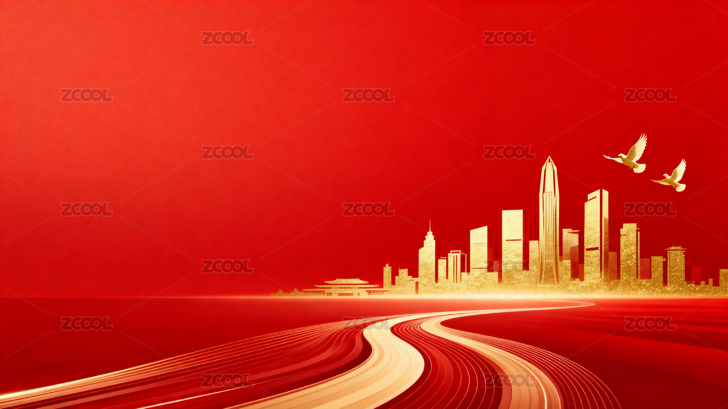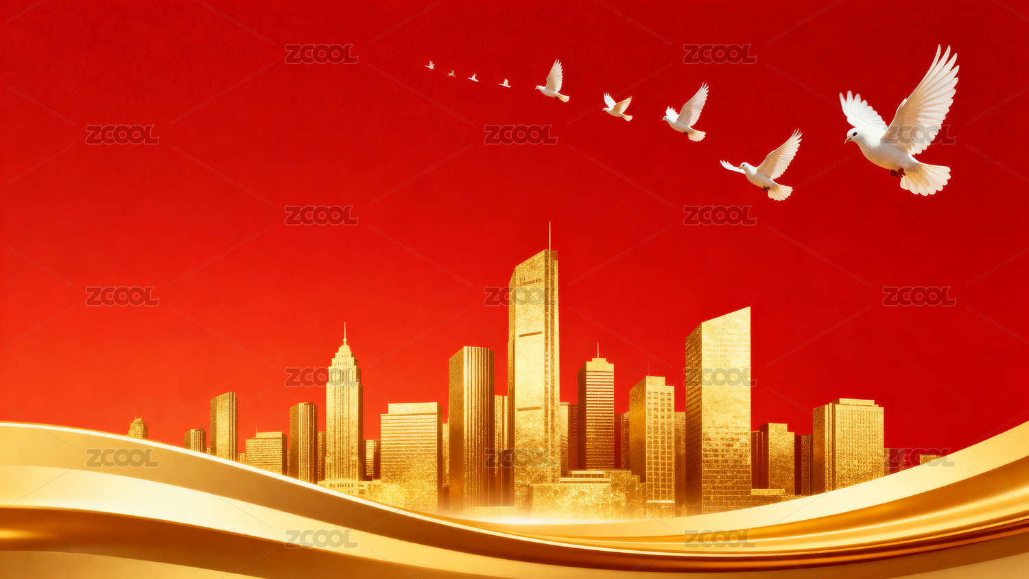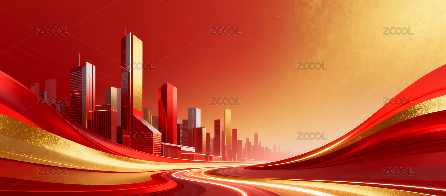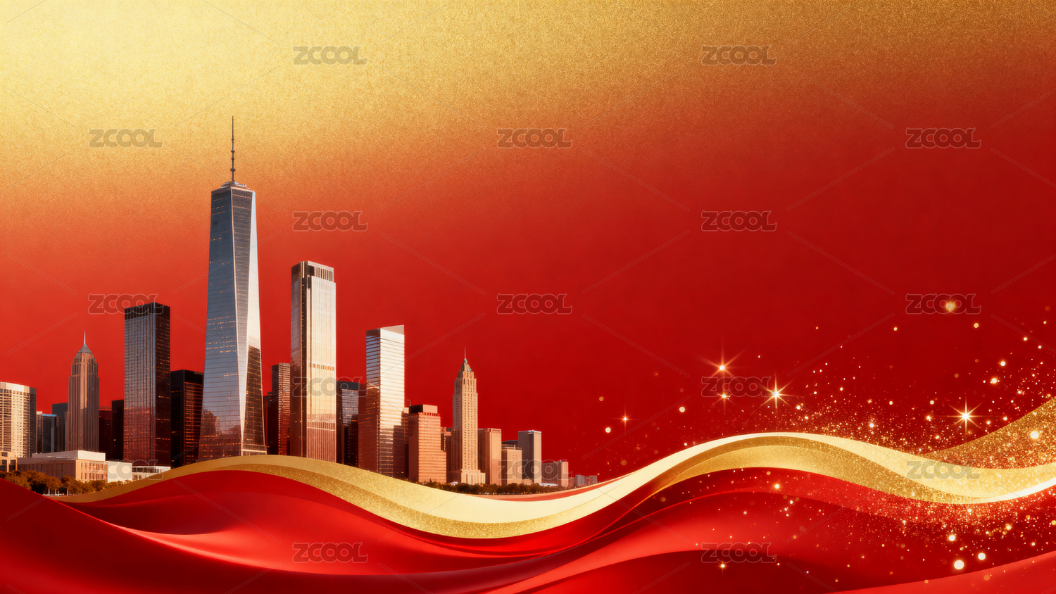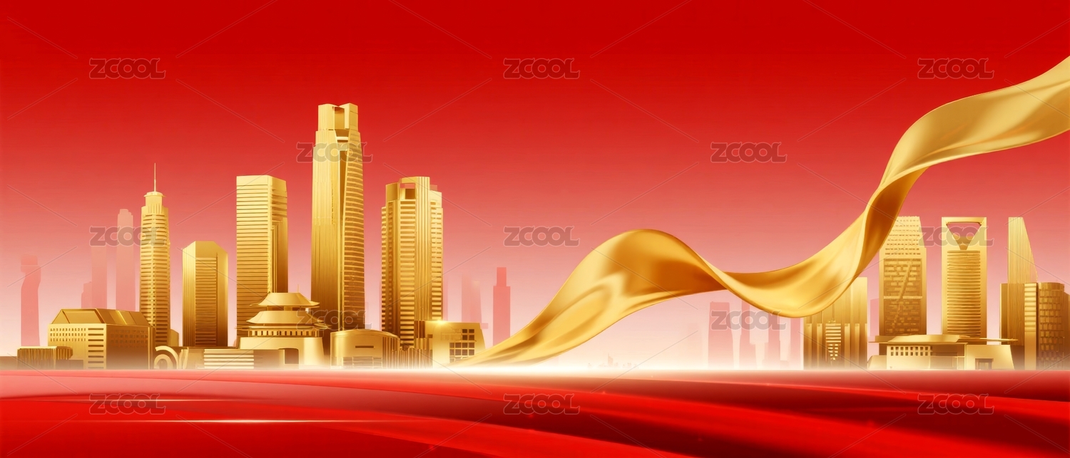 红金色绸缎布料城市建筑天际线商务庆典背景