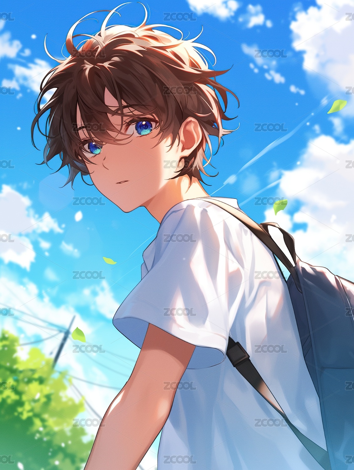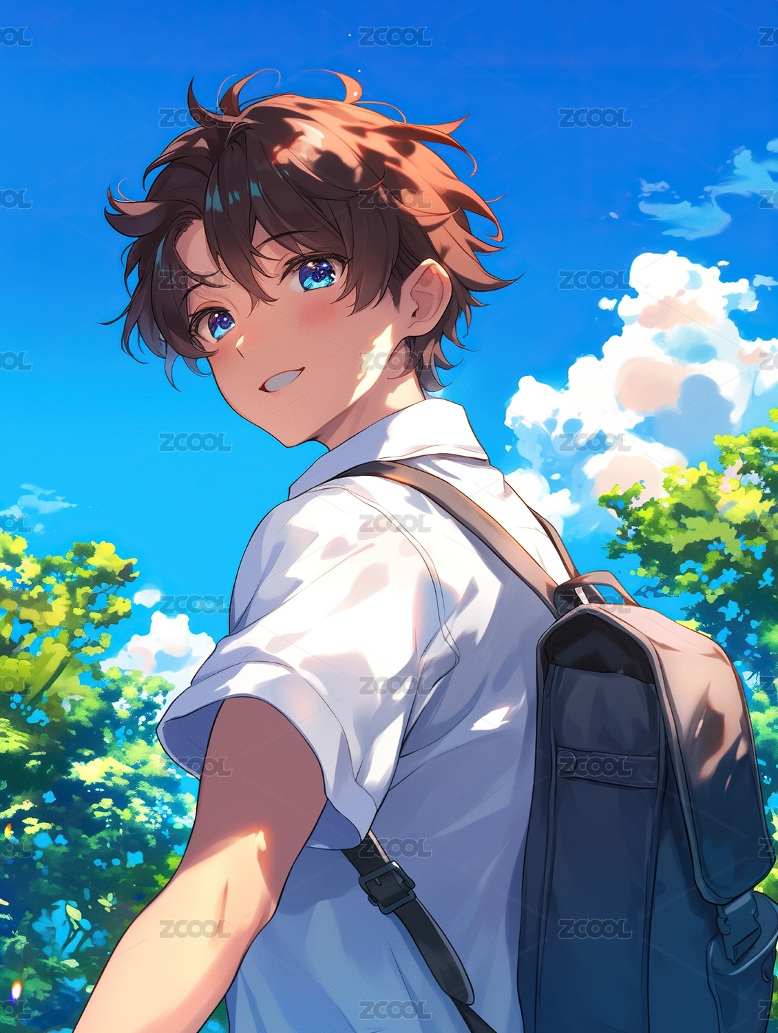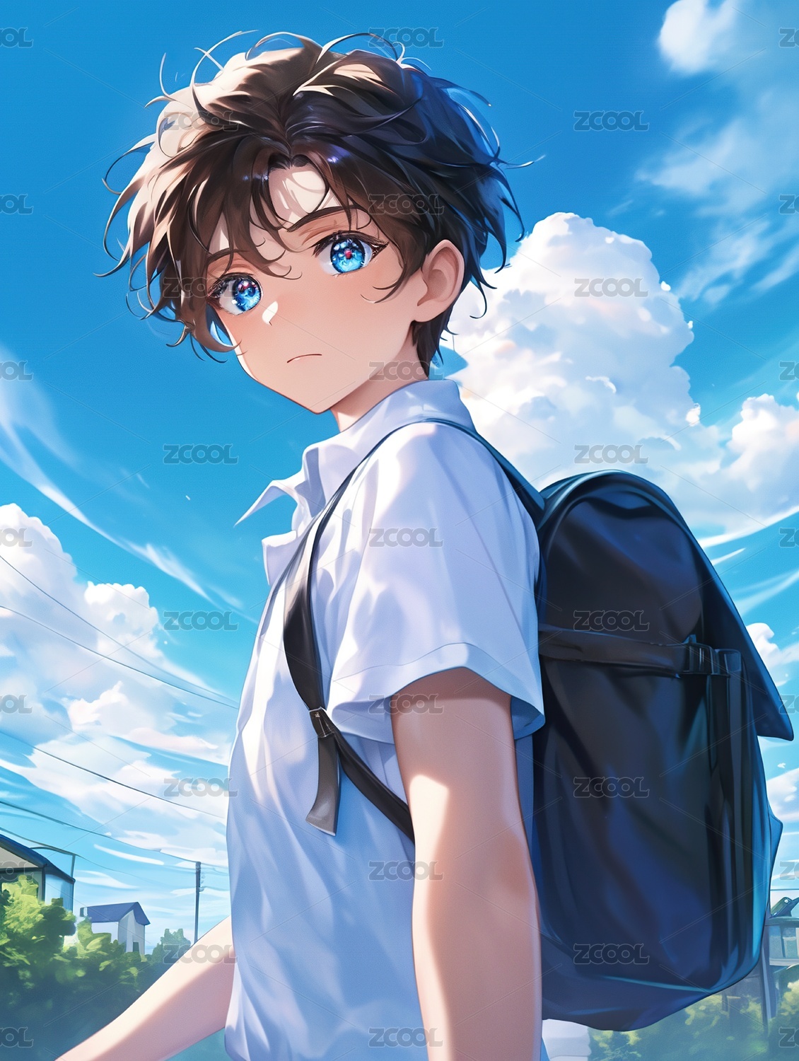 卡通,女孩,男孩,书包,学生,动漫,人物,蓝天,白云,高中生