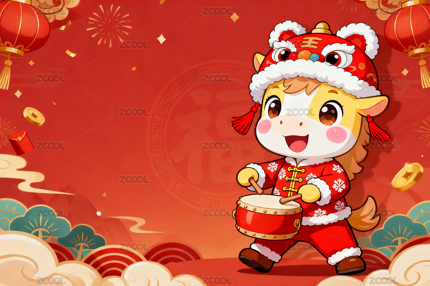 卡通小马贺新春敲鼓