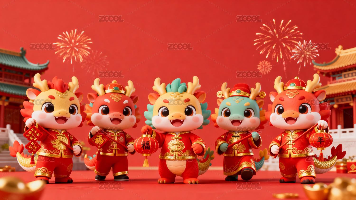 五只卡通龙迎新春烟花绽放