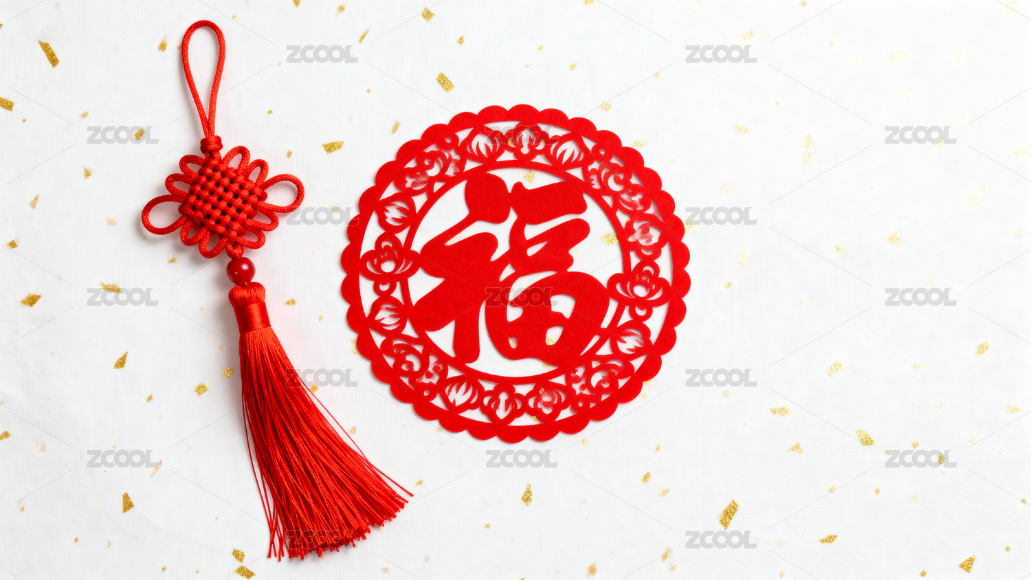 红色背景上的福字剪纸与中国结