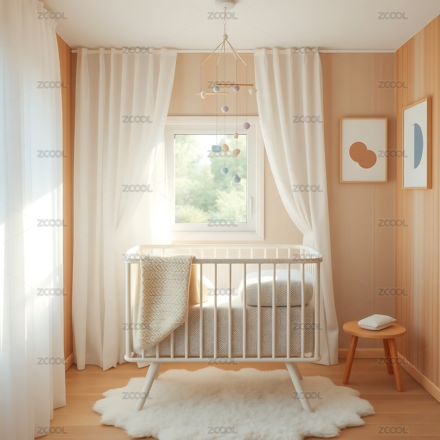 温馨婴儿房白色床铺与窗帘自然光线洒落营造宁静氛围