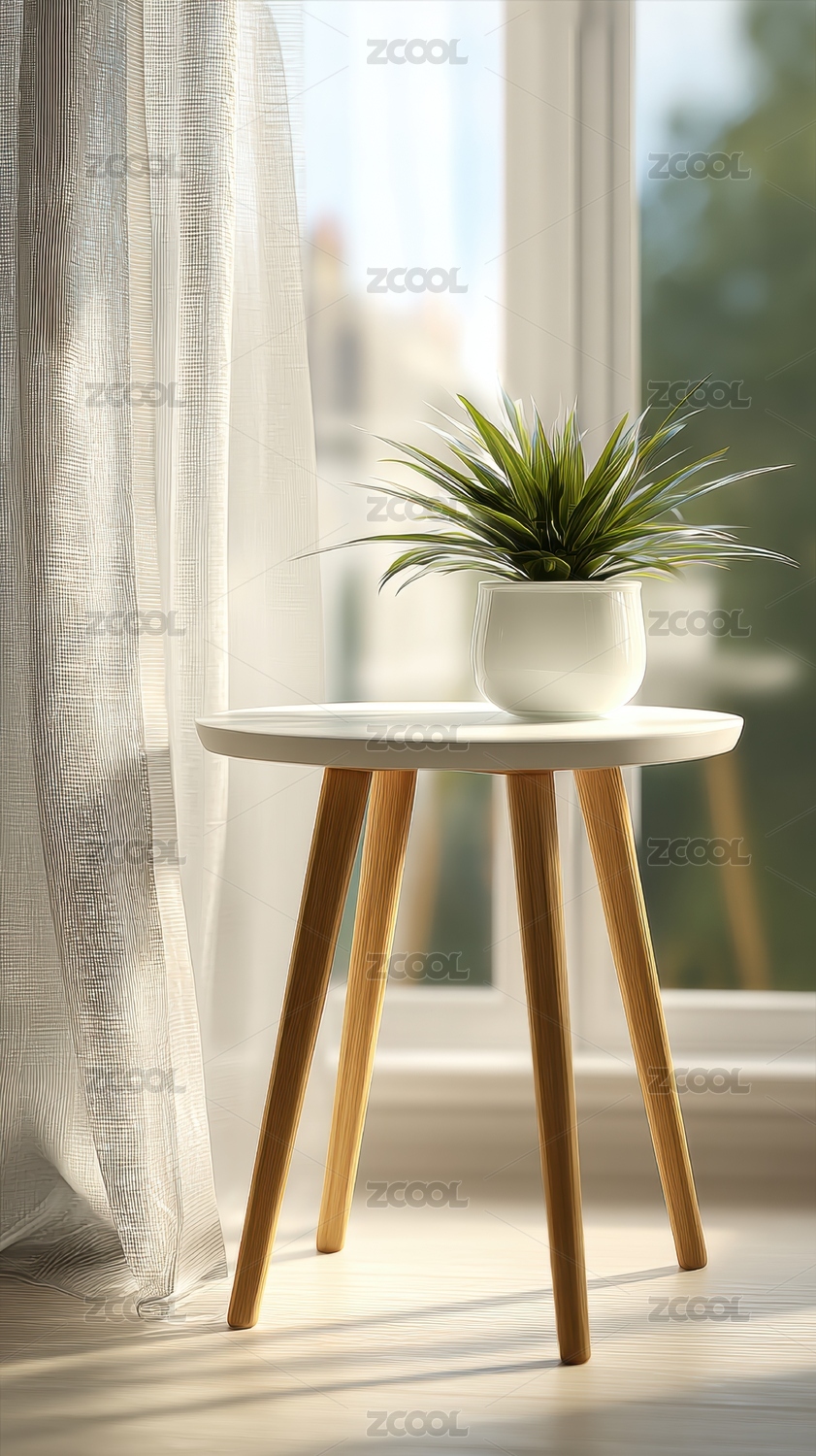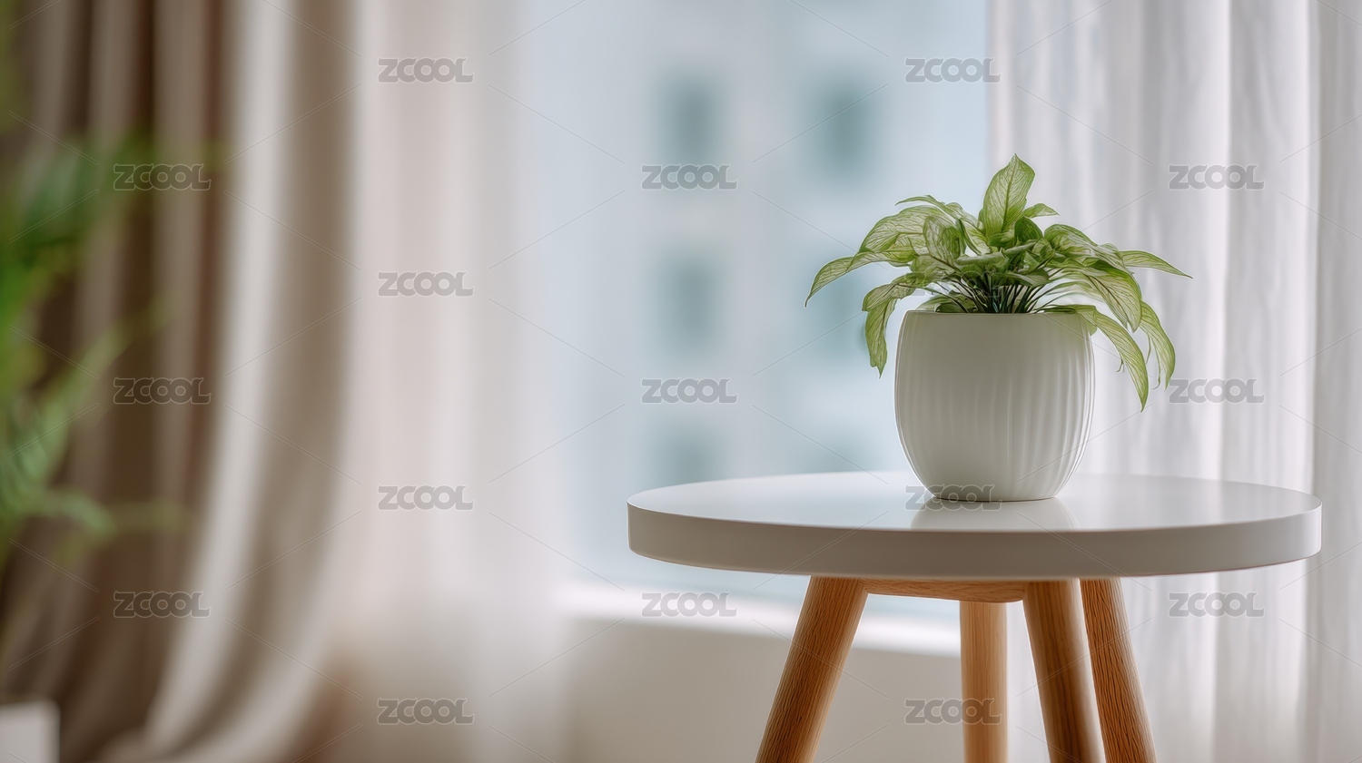 白色,绿色,植物,盆栽,桌子,木腿,圆形,窗户,窗帘,阳光