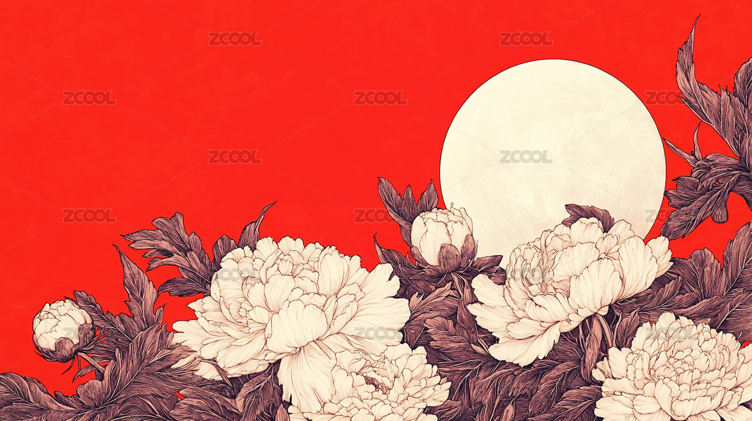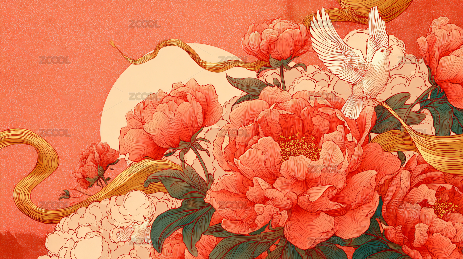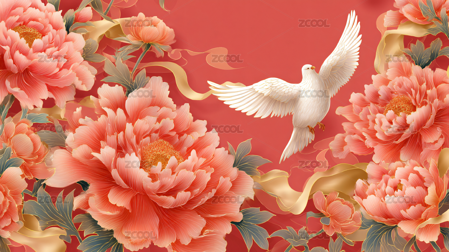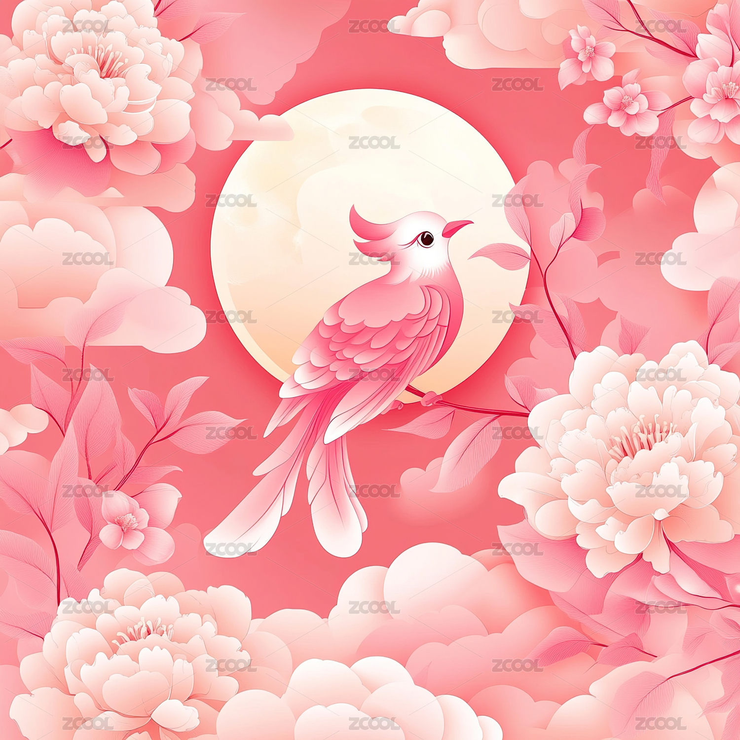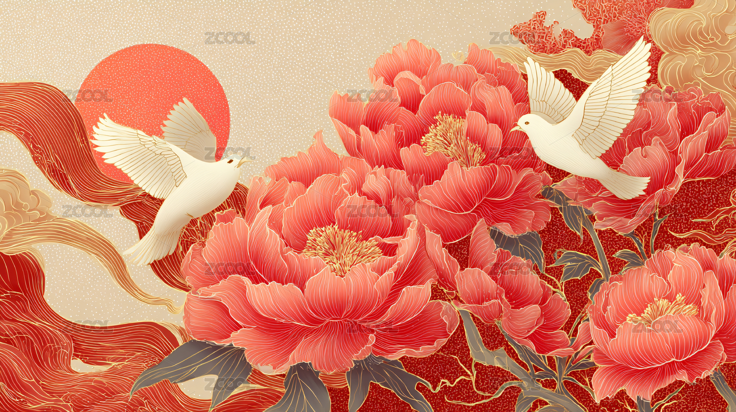 白鸽,牡丹,圆月,国风,吉祥,美好,艺术,装饰,清新,自然