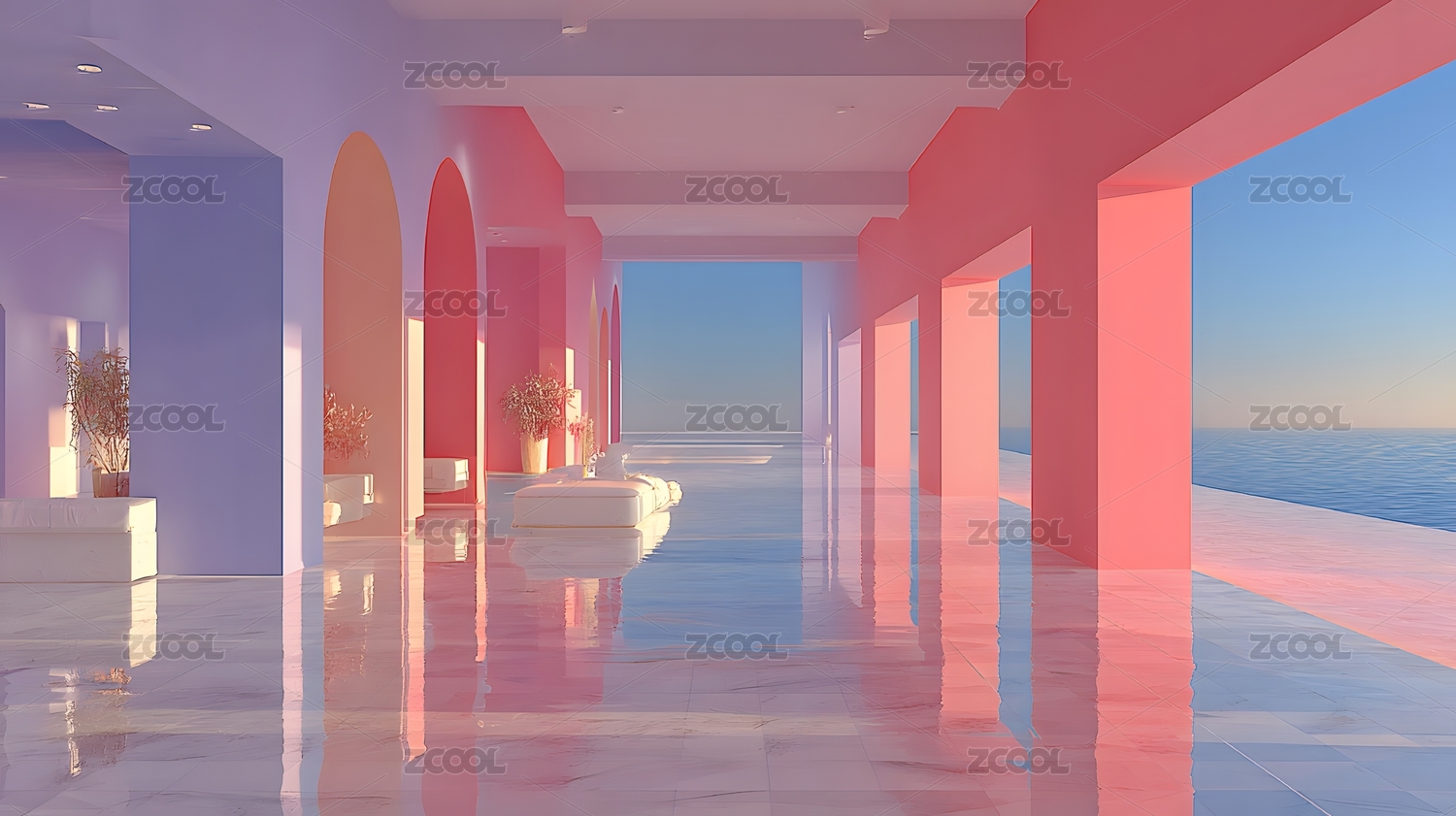 粉色长廊海景透视,梦幻唯美建筑