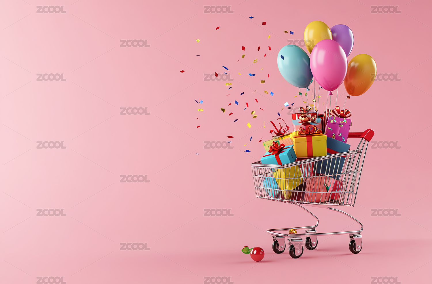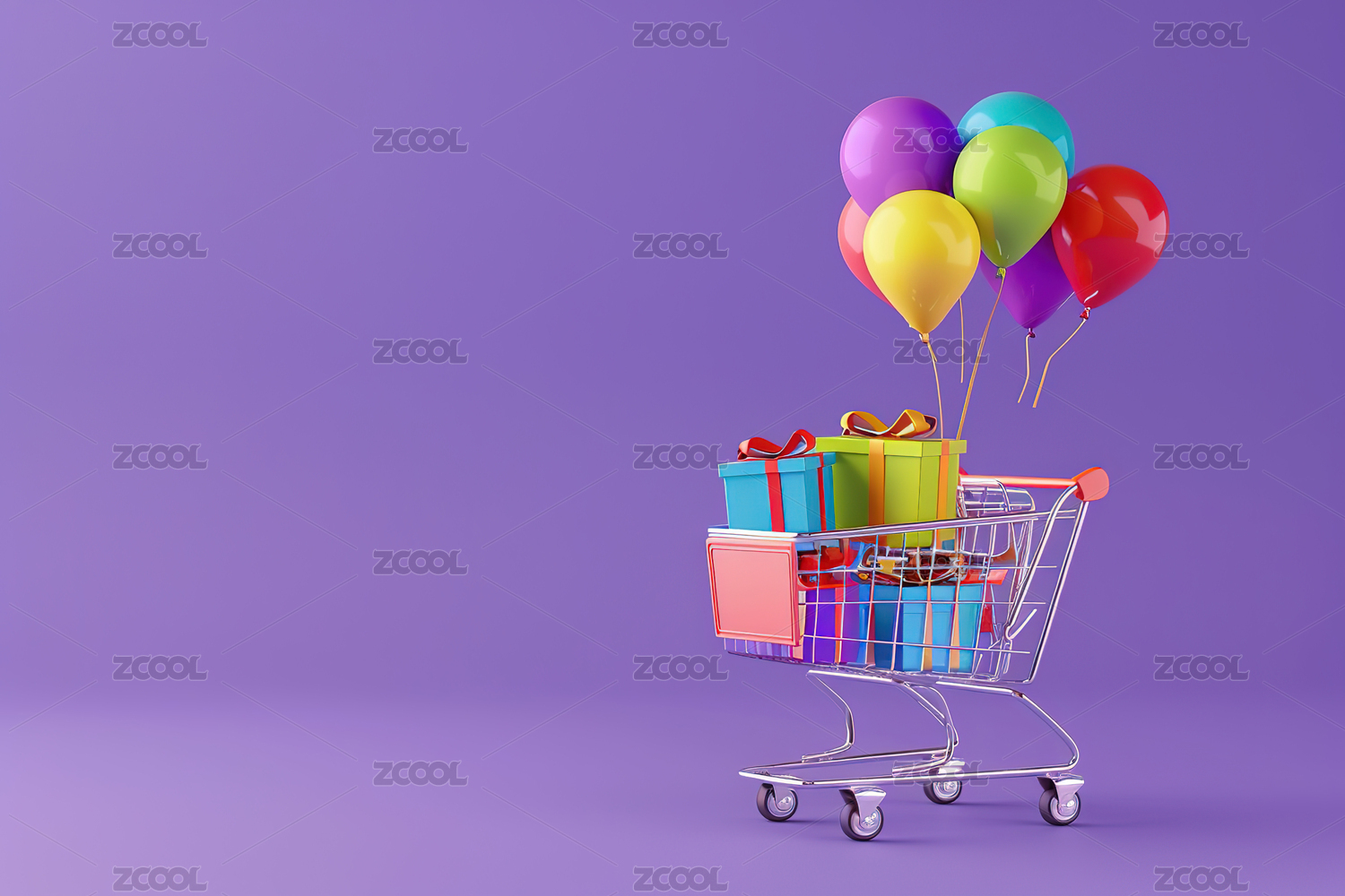彩色背景下购物车中的气球和礼品盒特写镜头