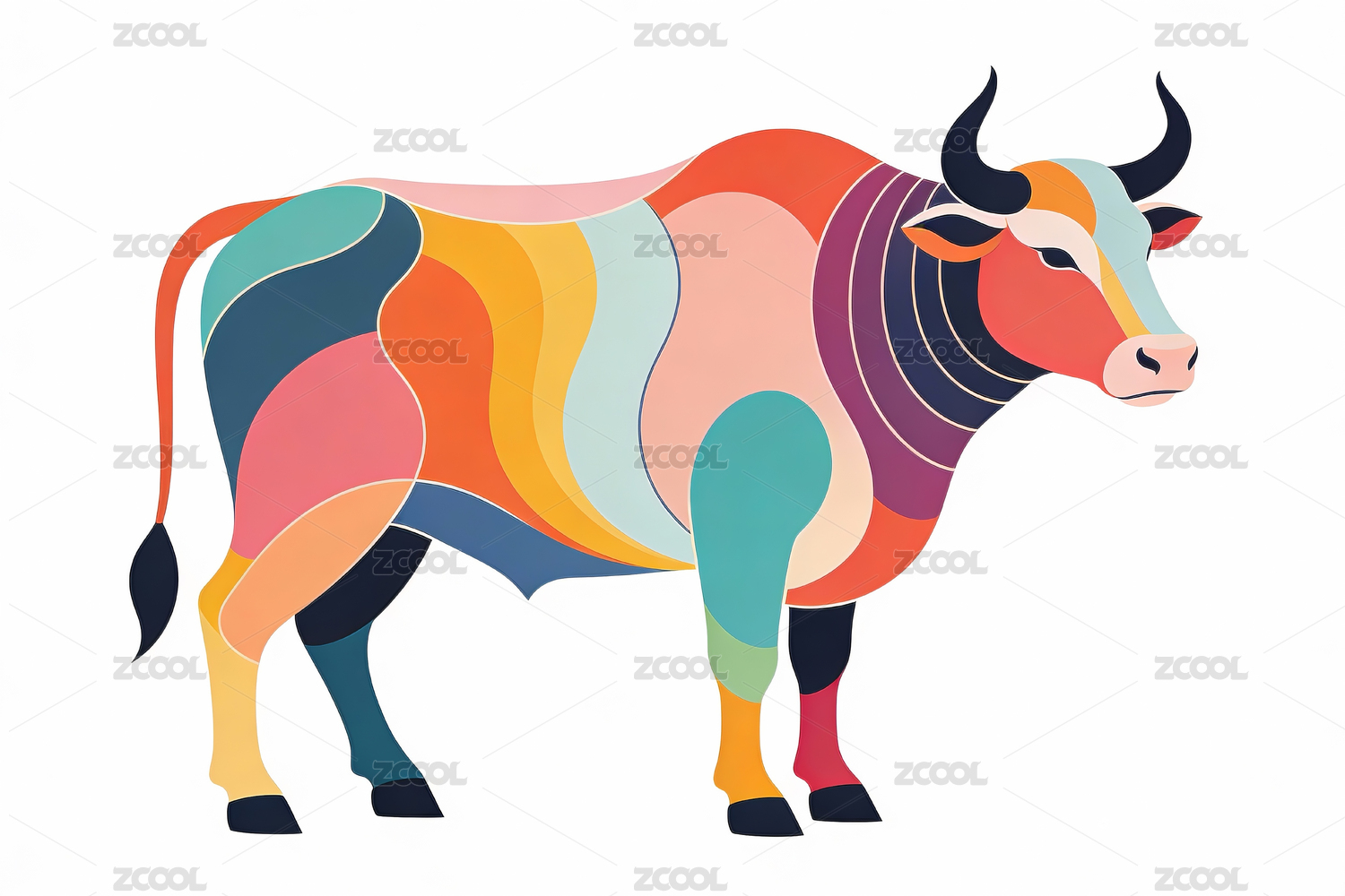 卡通牛形象,抽象色块组成的牛