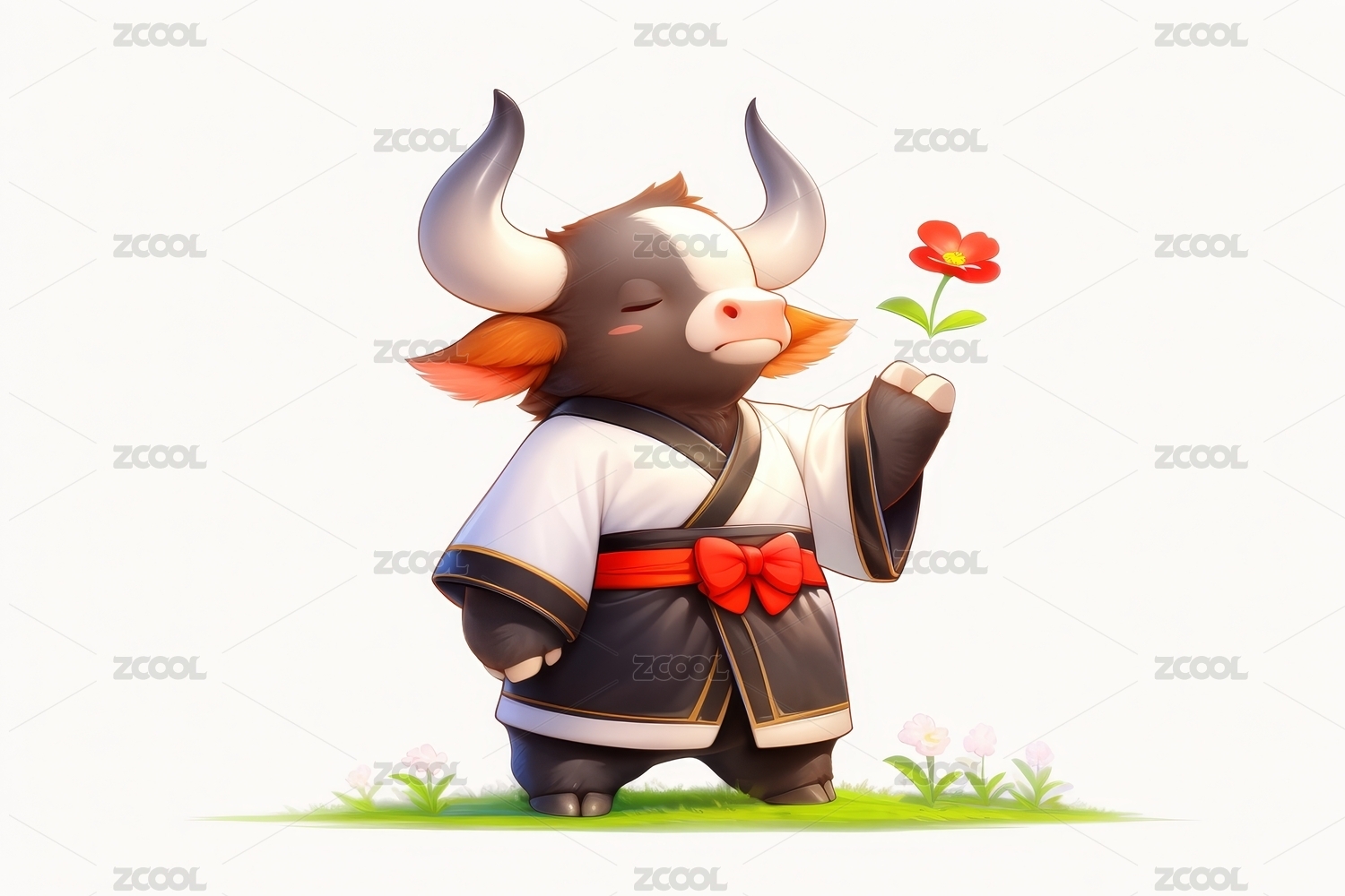 水墨风小牛持花图