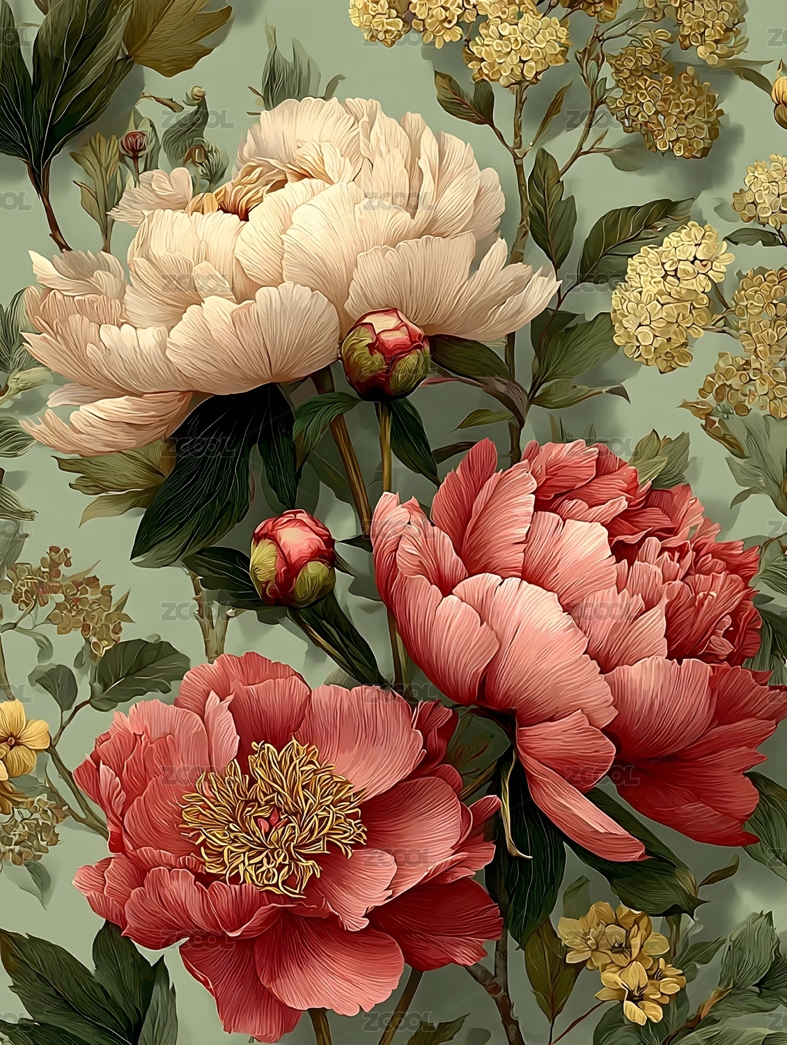 码复古牡丹和花蕾纹理图形海报手机端背景