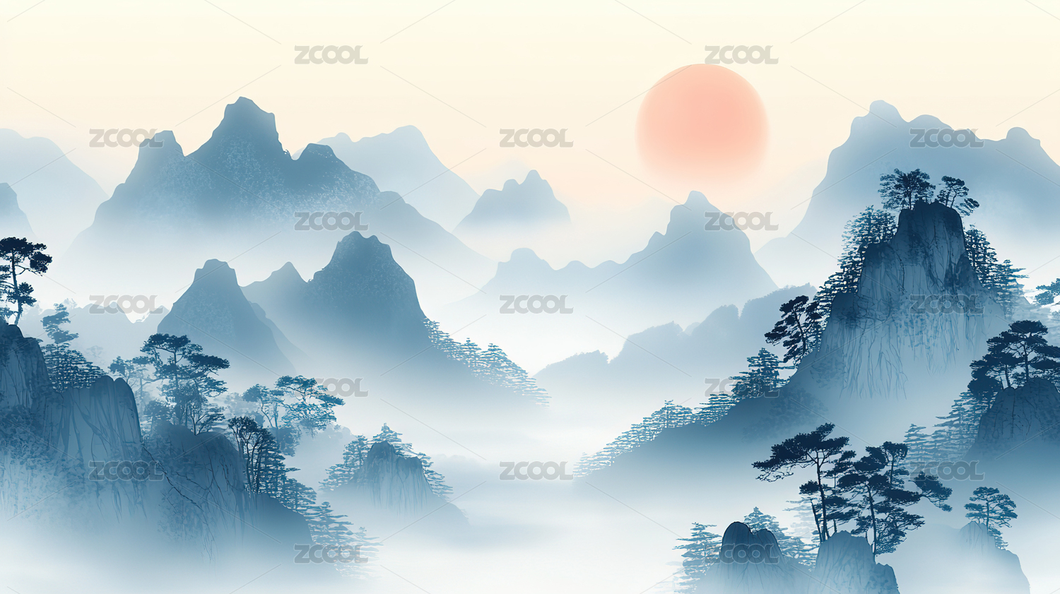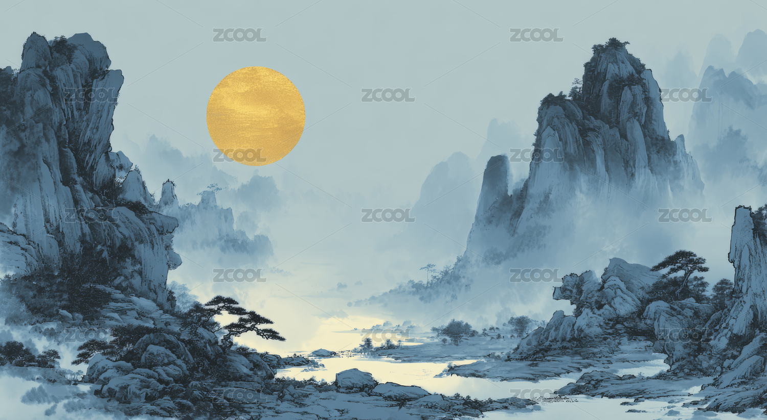 山水,夕阳,风景,绘画,意境,传统,唯美,水墨,古风,艺术