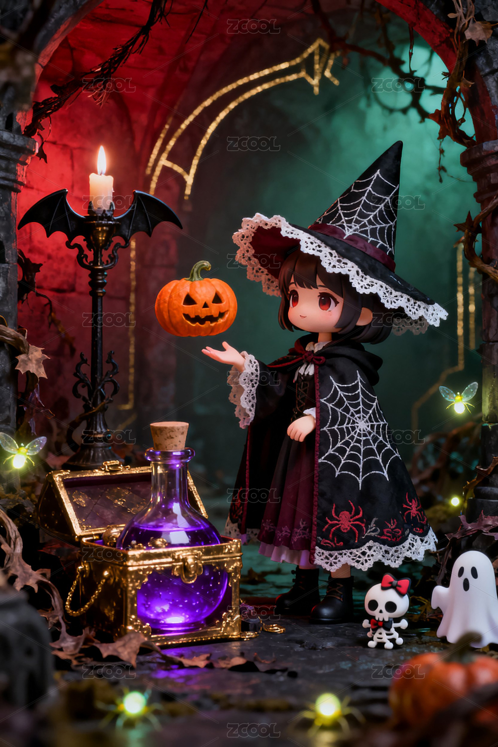万圣节,女巫,人偶,斗篷,蕾丝,尖帽,蜘蛛网,南瓜灯,悬浮,药水瓶
