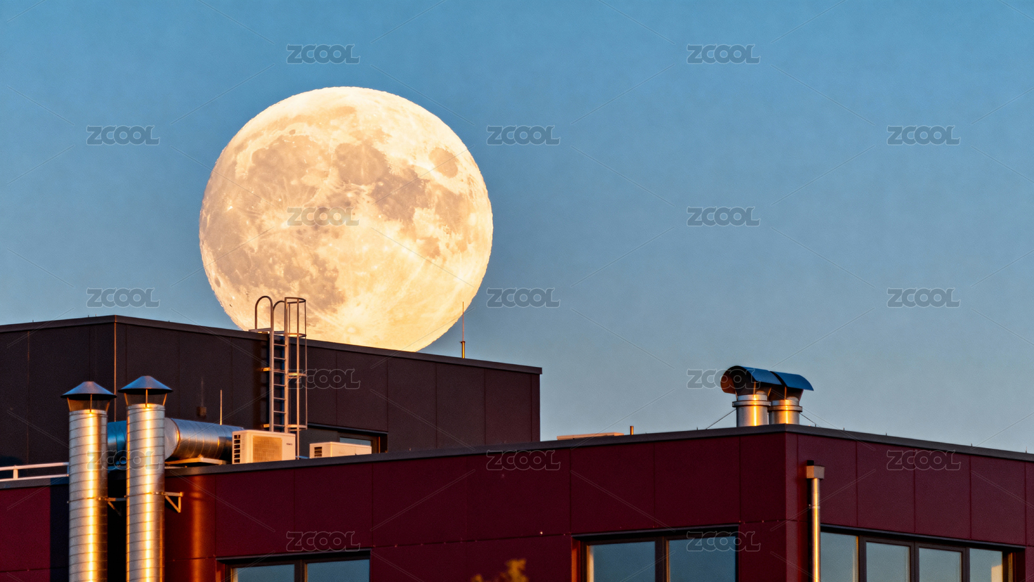 满月悬于现代建筑斜顶之上